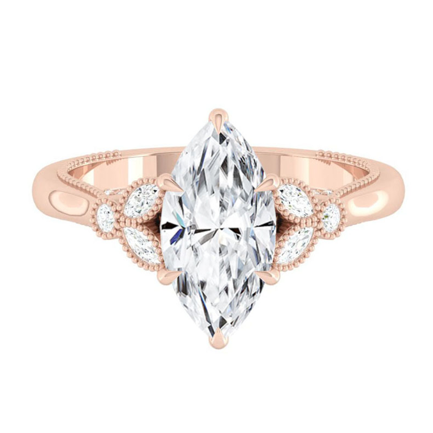This forever piece is a graceful medley of a cathedral setting and a flush cluster design, crowned with a marquise-cut center stone. The marquise cut engagement ring's delicate side accents and vintage-inspired milgrain details evoke the quiet beauty of nature, textured like leaves, timeless like love. It’s a ring for the one who sees love as something fresh and life-giving, like a breath of spring. A promise to spend a life together, full of wonder, growth, and shared adventures.