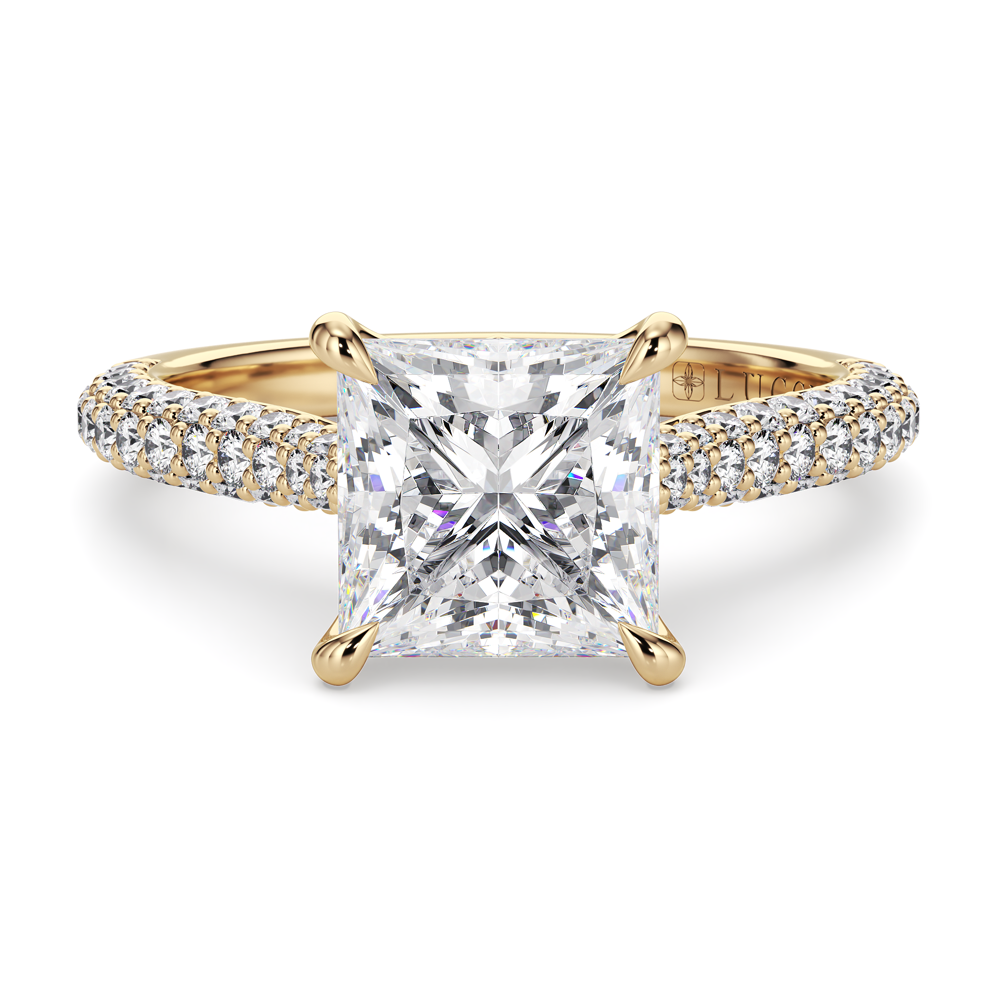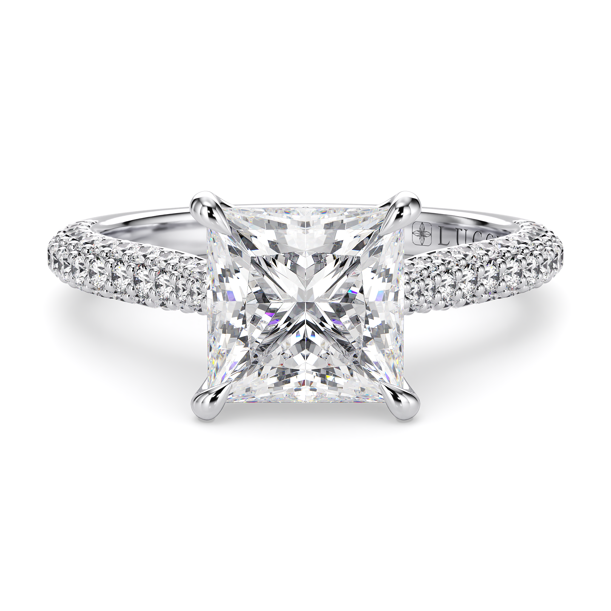 This forever piece is crafted with meaningful details, perfect for an unforgettable proposal. This princess cut diamond engagement ring features a radiant tri-row band, a graceful cathedral setting with tapered bridge accents, and Lucce’s signature petal prongs. The tri-row band sparkles from every angle, just like her, beautiful in every way you see her. This ring speaks of a love that says she deserves everything, and of your heartfelt promise to give her nothing less than your all.