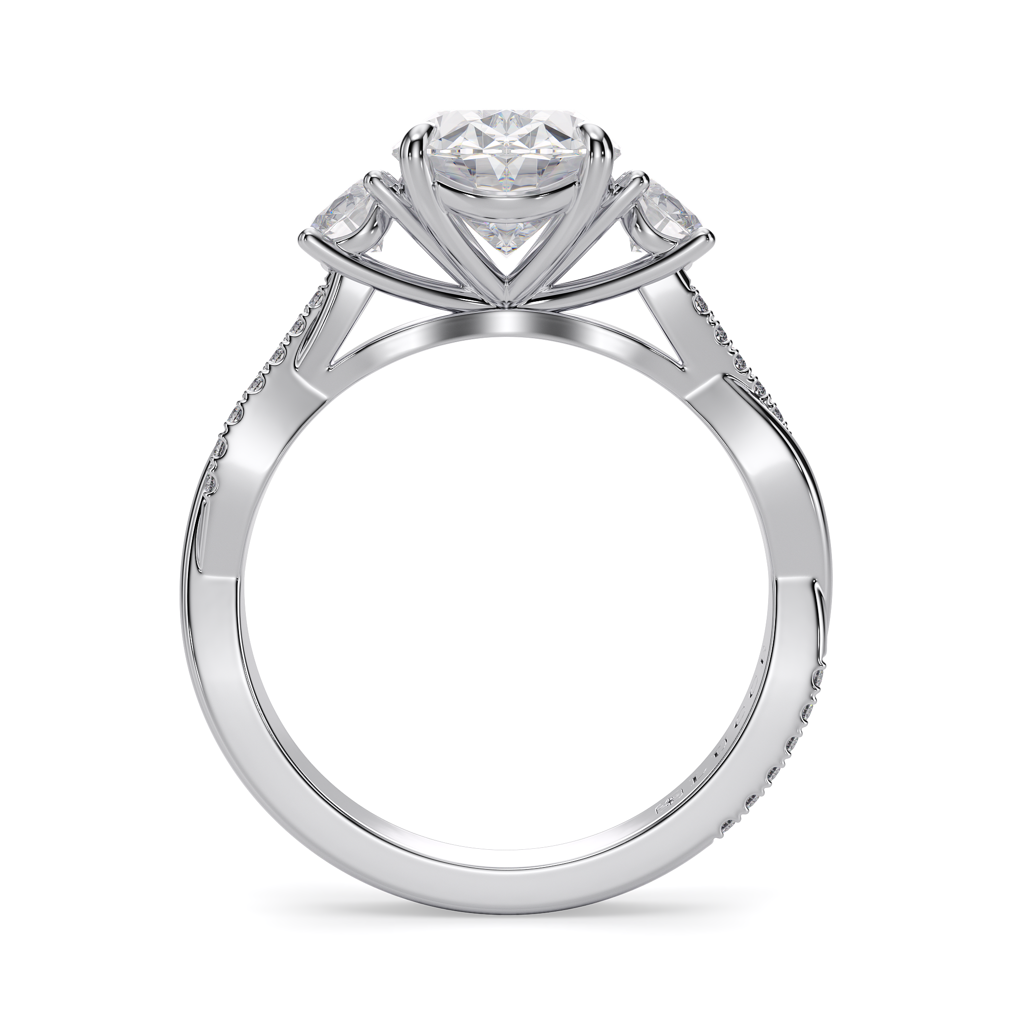 This forever piece showcases a graceful medley of a three-stone setting and a delicately twisting band. This oval cut diamond engagement ring's trio of stones blooms like a bouquet of flowers, each gem representing the love you've shared in the past, share in the present, and will share in the future. The vine-like band gently weaves around them, symbolizing two lives intertwined by love, forming an infinity that speaks of a bond that is unbreakable.