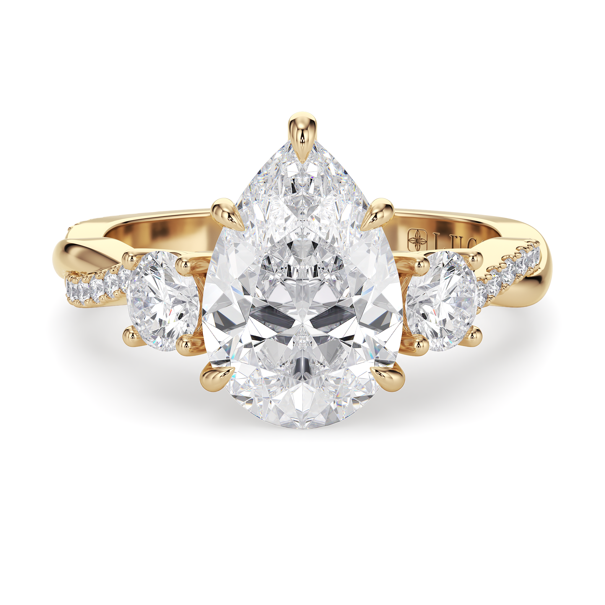 This forever piece showcases a graceful medley of a three-stone setting and a delicately twisting band. This pear cut diamond engagement ring's trio of stones blooms like a bouquet of flowers, each gem representing the love you've shared in the past, share in the present, and will share in the future. The vine-like band gently weaves around them, symbolizing two lives intertwined by love, forming an infinity that speaks of a bond that is unbreakable.