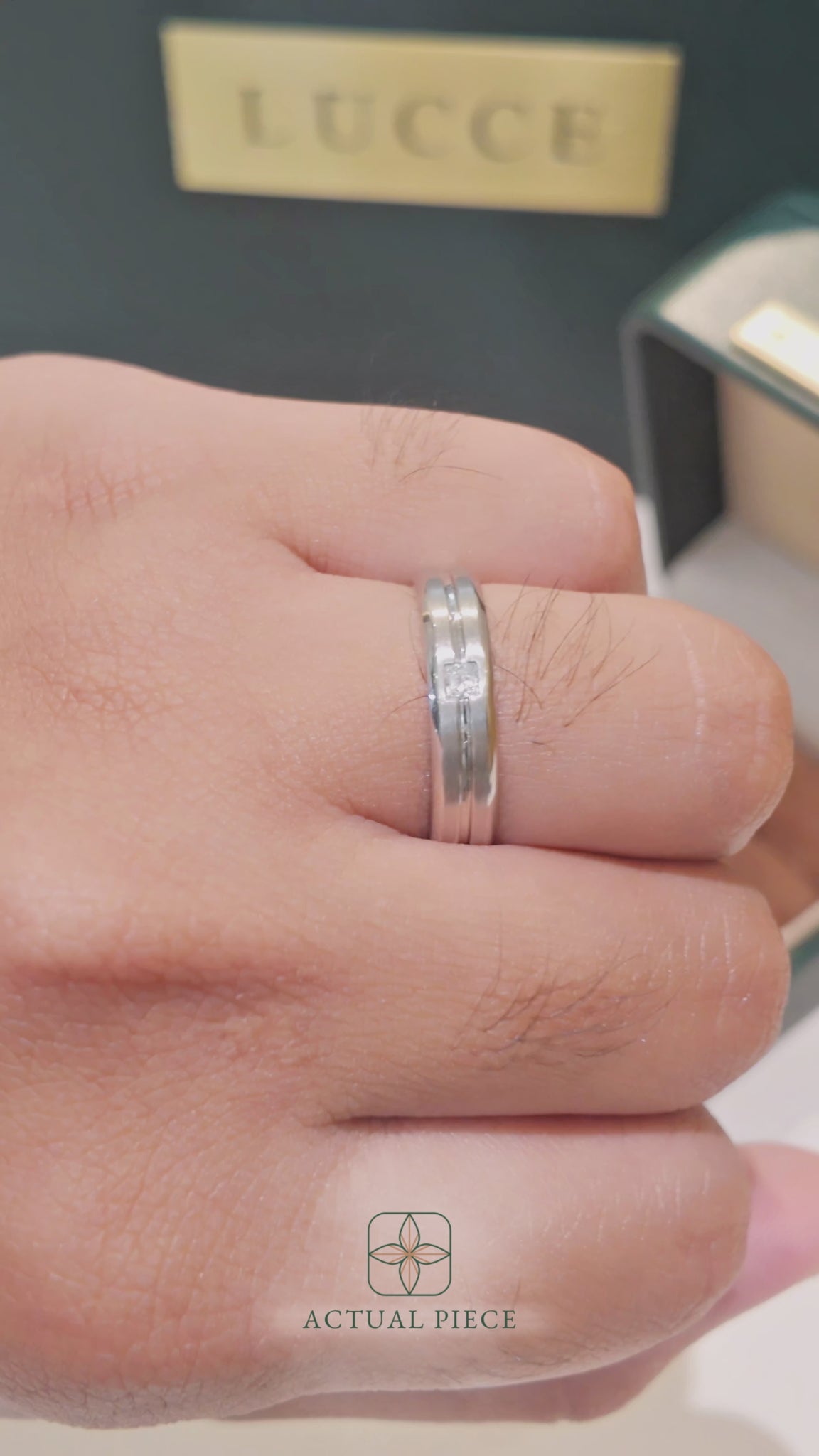 Contemporary elegance defines the Lucce Philip Mi Polished, featuring a clean straight center groove and sleek beveled edges. A single princess cut diamond is set with precision along the groove, adding a refined touch of brilliance to the simplistic design.