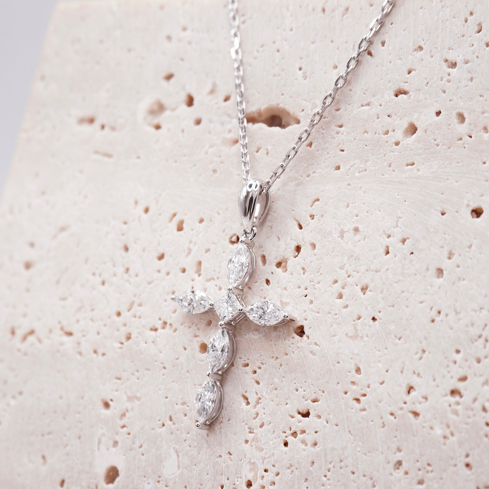 Embrace elegance and faith with the Saved Cross Necklace. This stunning piece features a cross pendant adorned with five marquise cut moissanites and a central princess cut moissanite. Crafted for brilliance and sustainability, it hangs on a delicate chain with Lucce's signature bail. Perfect for daily wear or special occasions, this necklace is a timeless symbol of style and spirituality.
