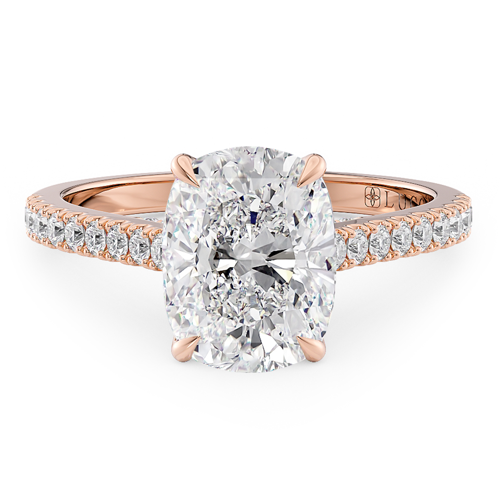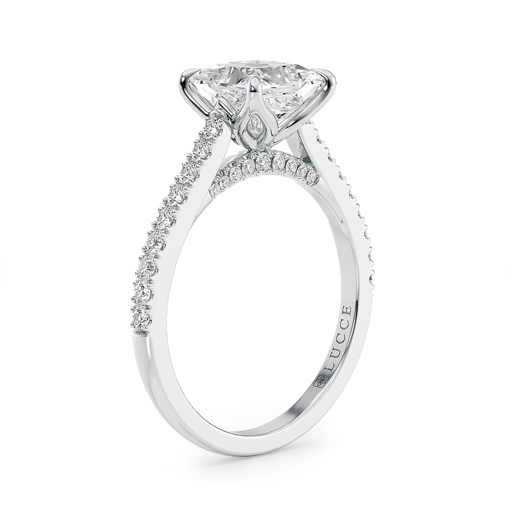 This forever piece showcases a pavé cathedral setting with an accented tapered bridge and delicate petal prongs. Like a captivating flower in full bloom, this cushion cut diamond engagement ring is offered to the one your heart cherishes most. The graceful arcs of the cathedral rise toward the petals, symbolizing how you see her, your queen, radiant and blossoming. The tapered bridge reflects the journey you share, as you cross into a new chapter of love, hand in hand.