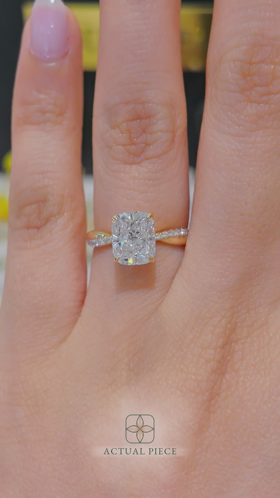 This forever piece features a twisting accented band and Lucce’s signature petal prongs. This cushion cut diamond engagement ring's vine-like band symbolizes two lives intertwined by love, forming an infinity that speaks of a bond that is unbreakable. Like a delicate flower found in vines, it reflects how you found her, beautiful, one-of-a-kind, and meant to be.