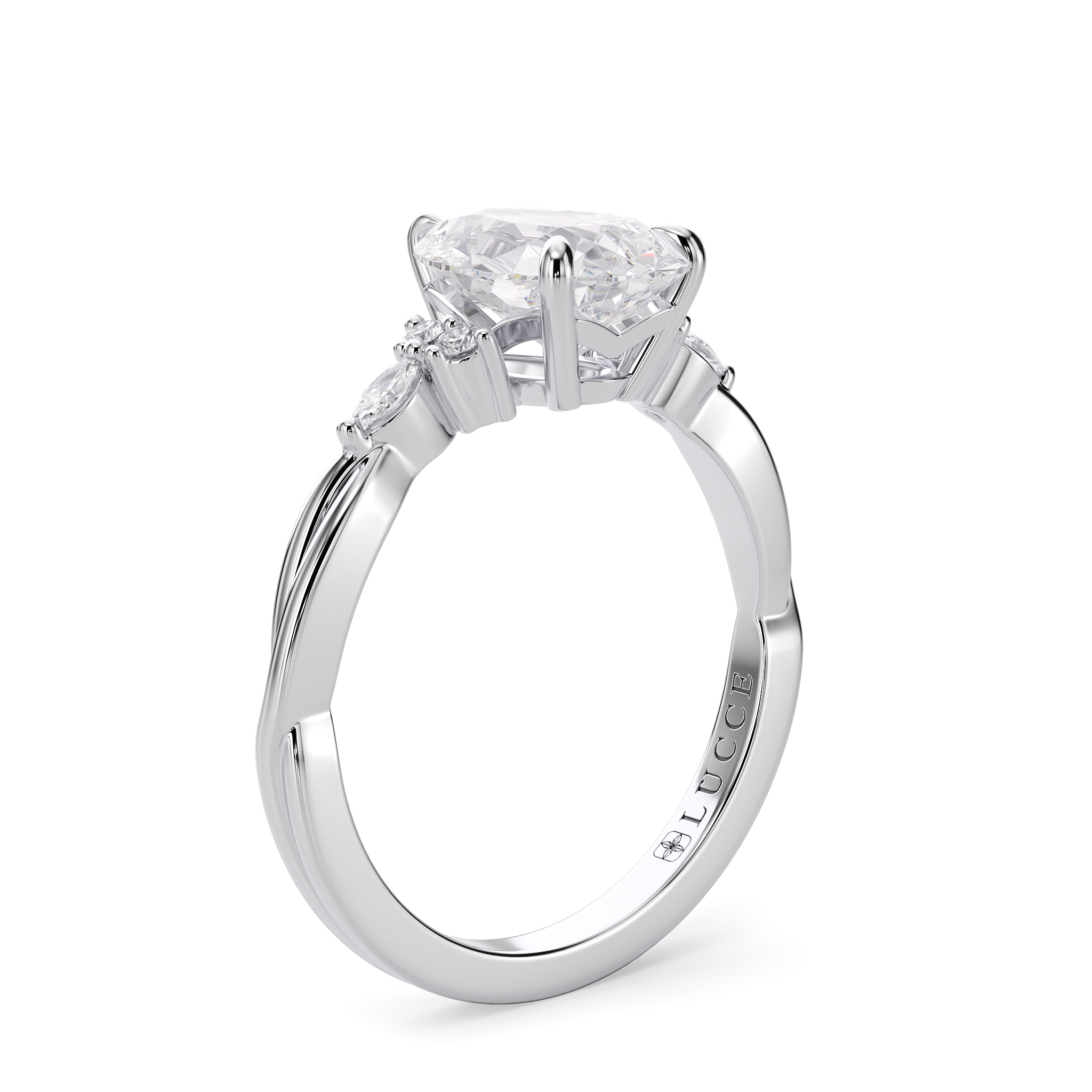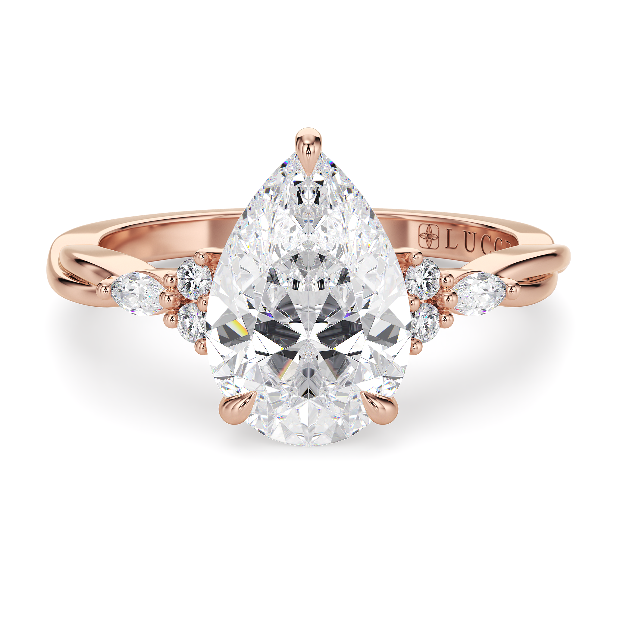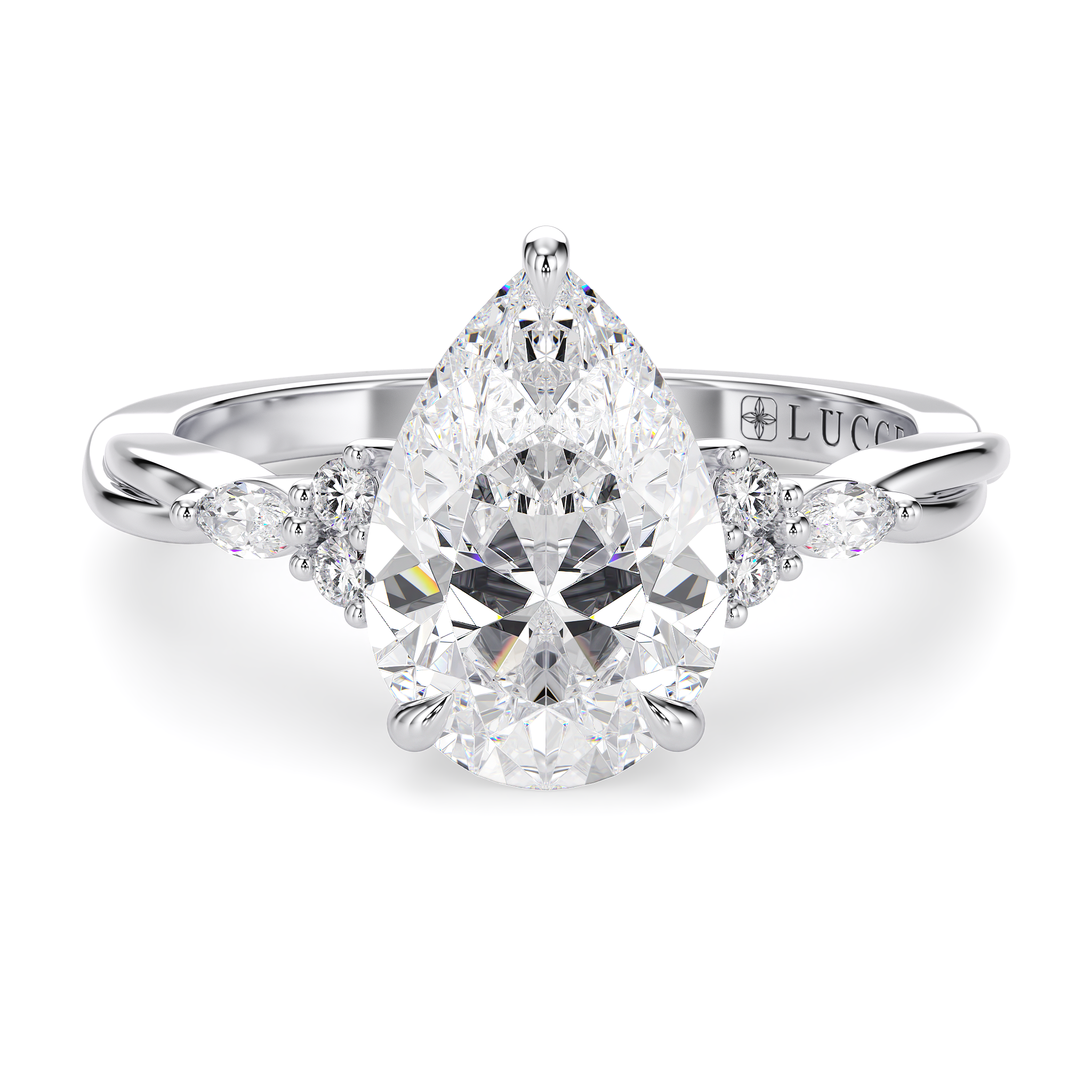 This forever piece features a low-profile setting, delicate cluster accents, and a graceful twisting band. Set with seven stones, this pear cut-cut diamond engagement ring symbolizes that she is your perfect one, the missing piece that completes you. The twisting band speaks of your infinite love, a vow to stand beside her through every twist, turn, and chapter life brings.