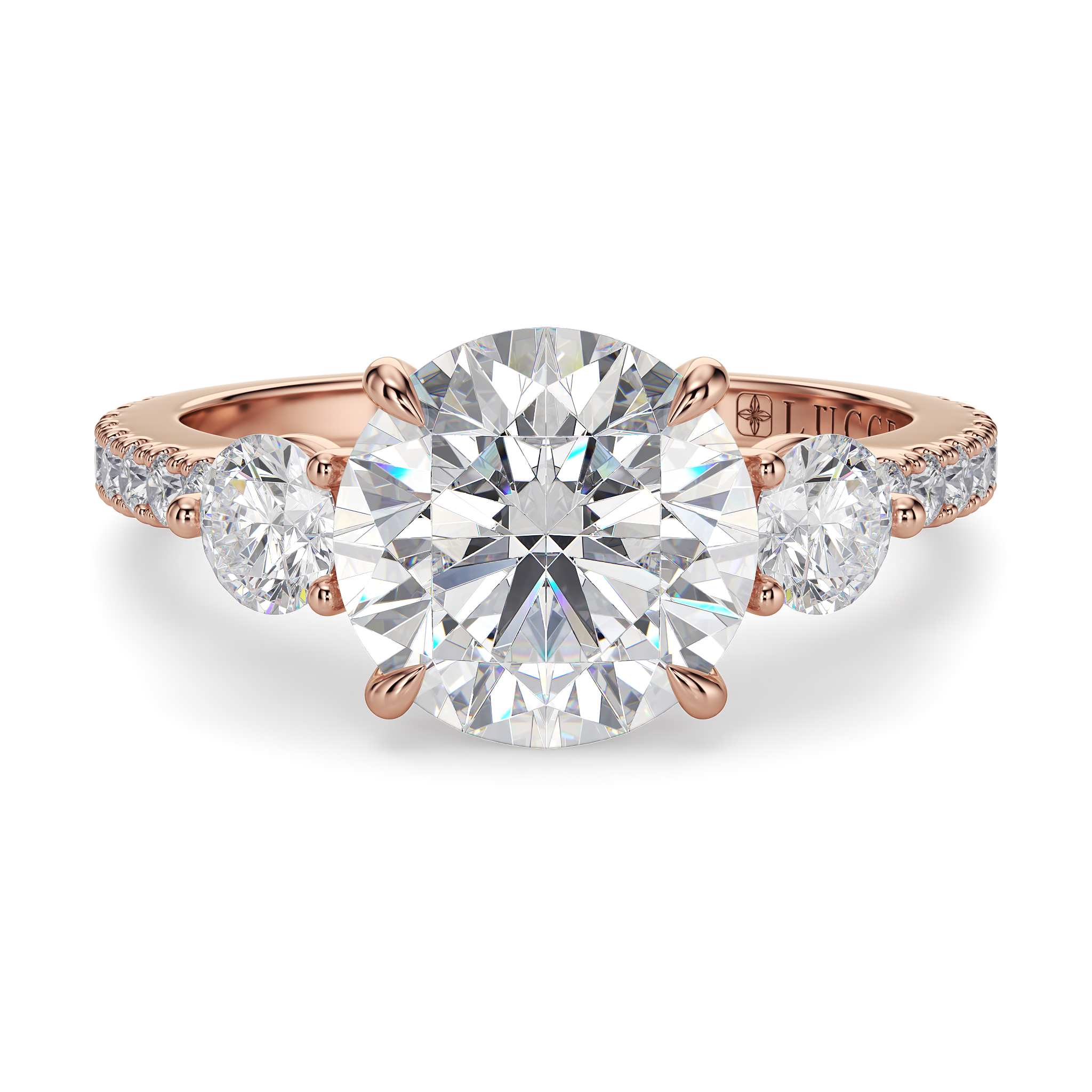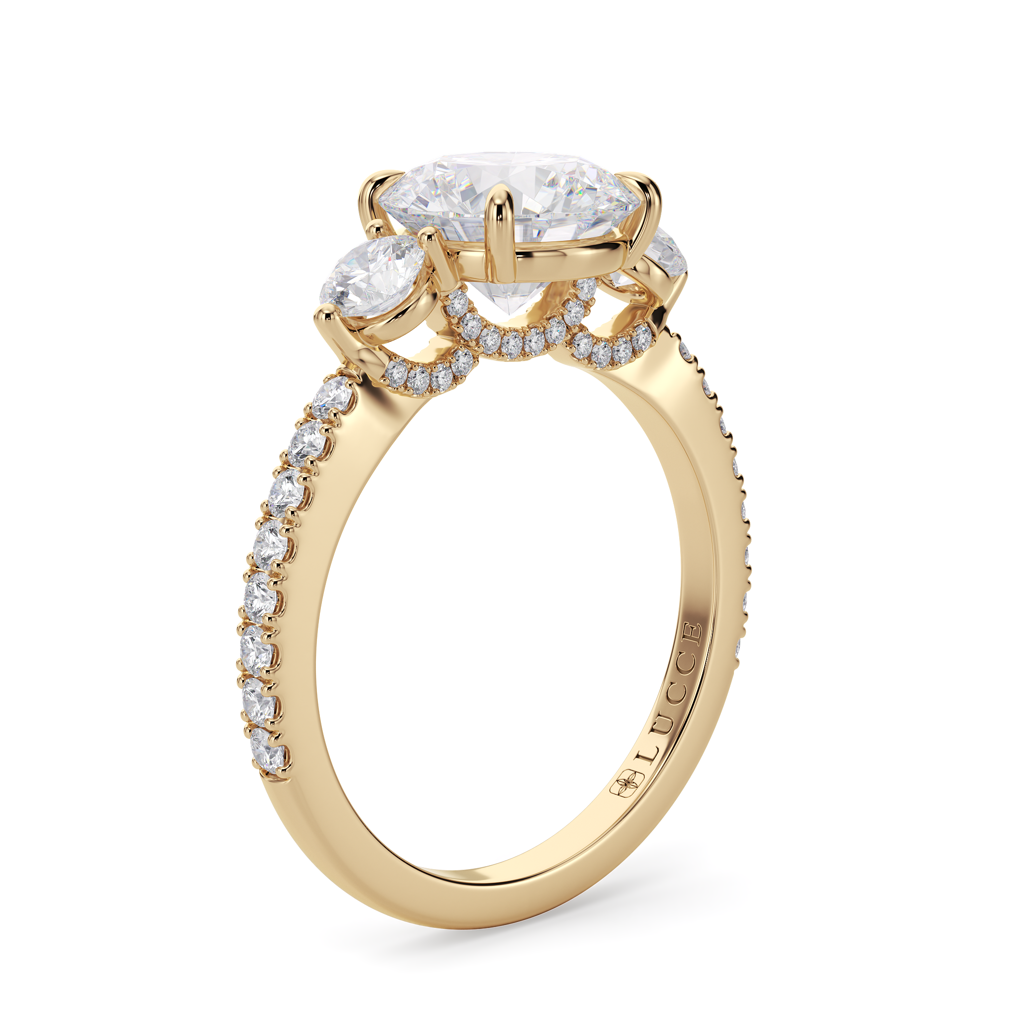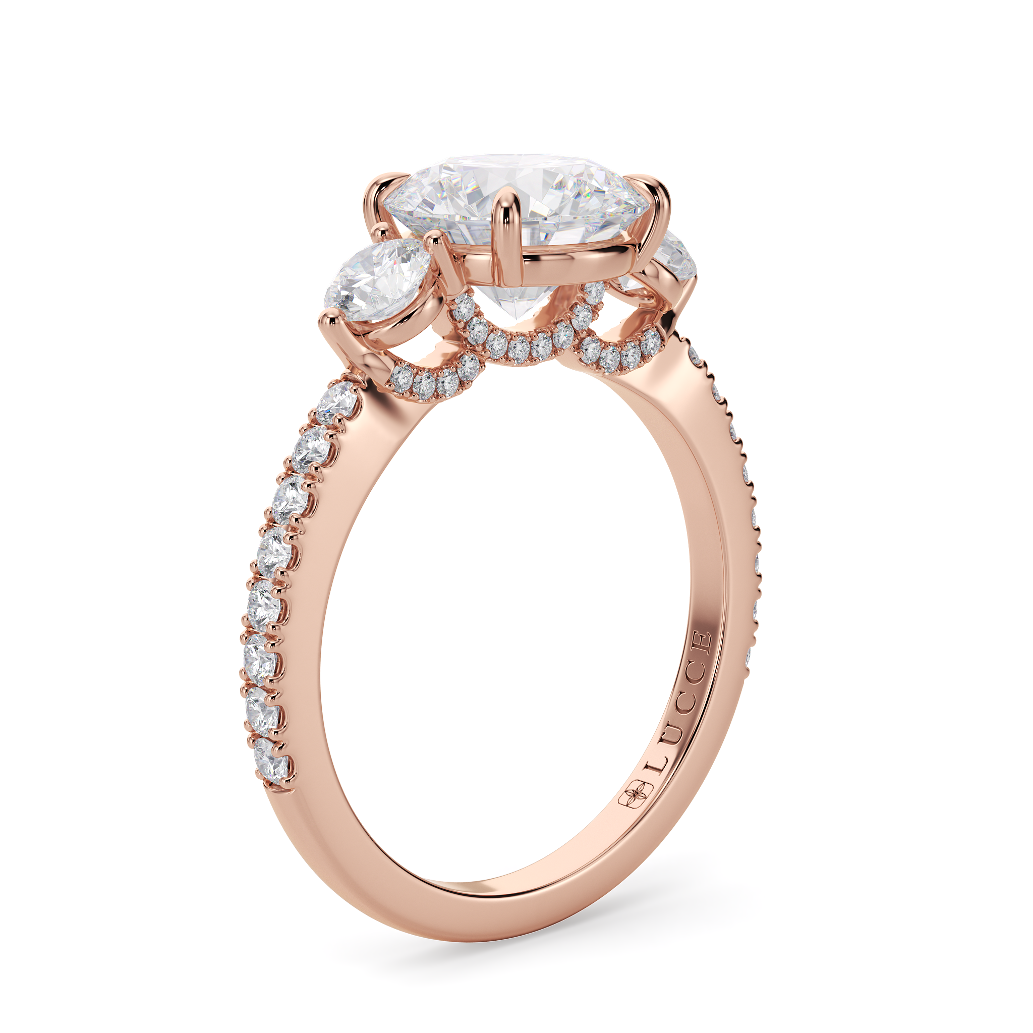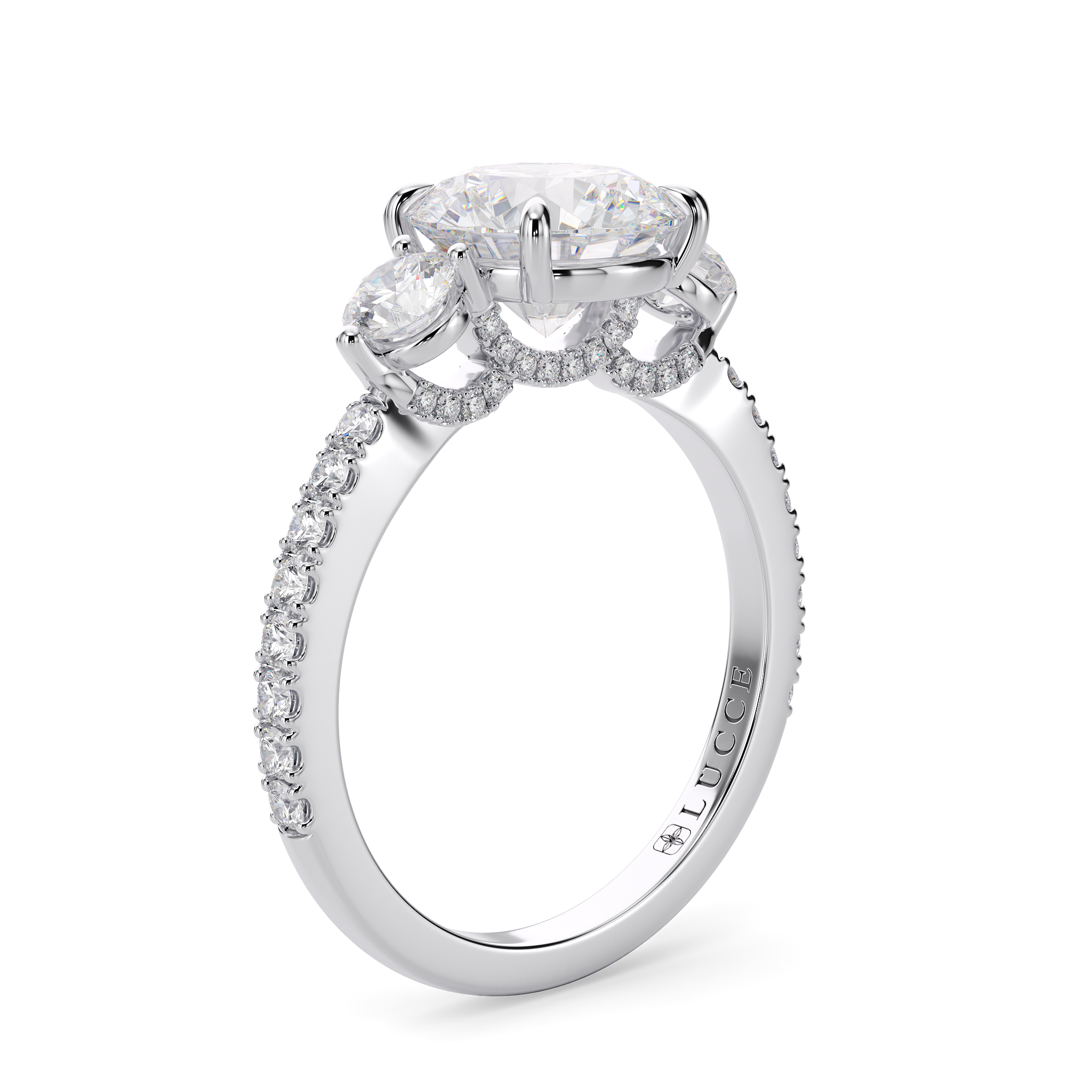 This forever piece features a timeless three-stone setting with hidden, heartwarming accents and a pavé band. Designed to hold a round-cut center diamond embraced by round side stones, each gem represents a chapter of your love, the past, present, and the future you promise to build together. The hidden accents reflect the quiet kind of love you share, the kind that needs no display, only the two of you to feel its depth.