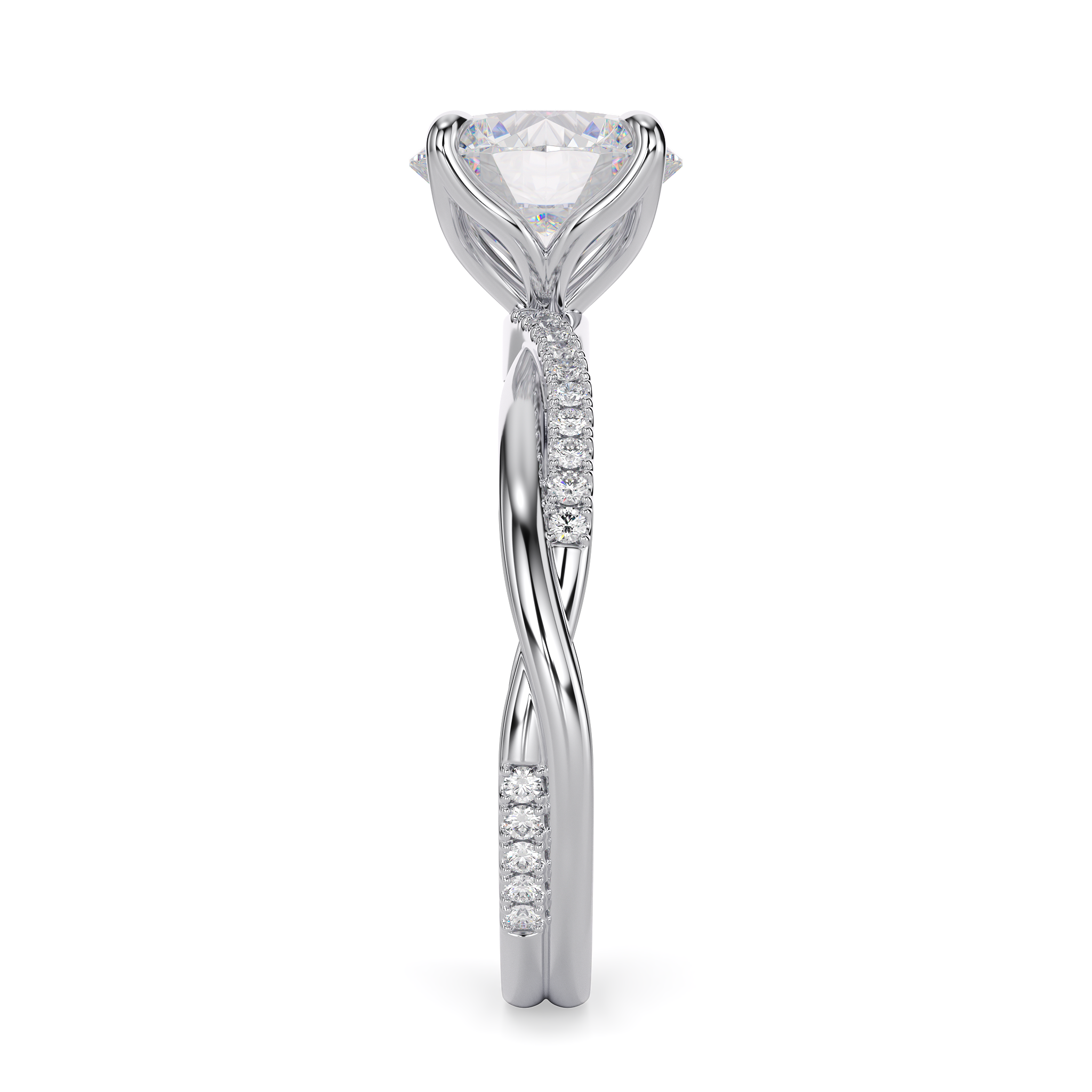 This forever piece features a twisting accented band and Lucce’s signature petal prongs. This round cut diamond engagement ring's vine-like band symbolizes two lives intertwined by love, forming an infinity that speaks of a bond that is unbreakable. Like a delicate flower found in vines, it reflects how you found her, beautiful, one-of-a-kind, and meant to be.
