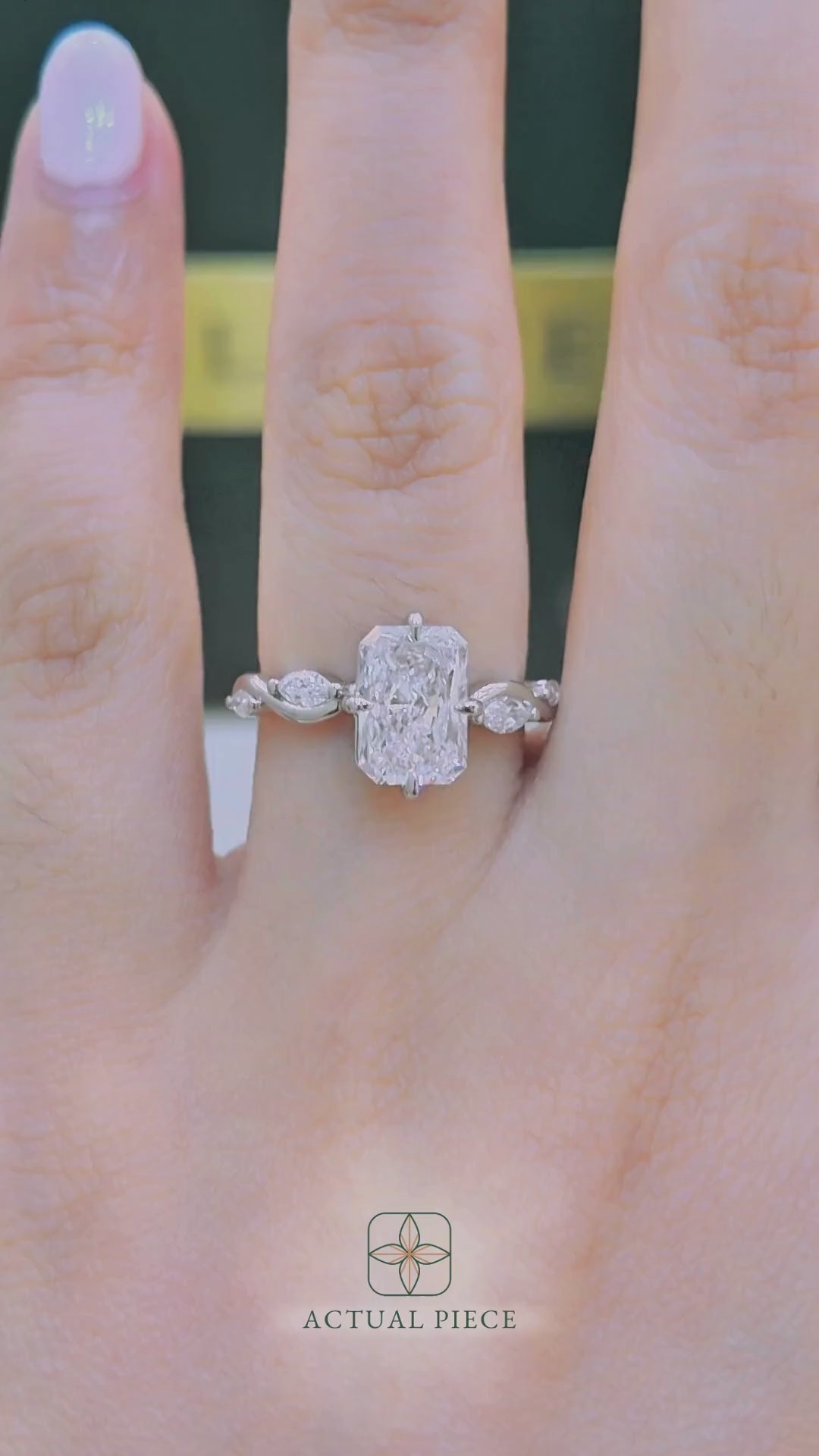 This forever piece features a low profile setting and marquise-cut diamonds nestled in twisting vines, elements that echo Lucce’s iconic emblem. This radiant cut diamond engagement ring's low setting mirrors the kind of love you share, quiet and grounded yet full of depth and meaning. The marquise diamonds in twisting vines form an infinity design, representing a love that is forever true and constant through all times.