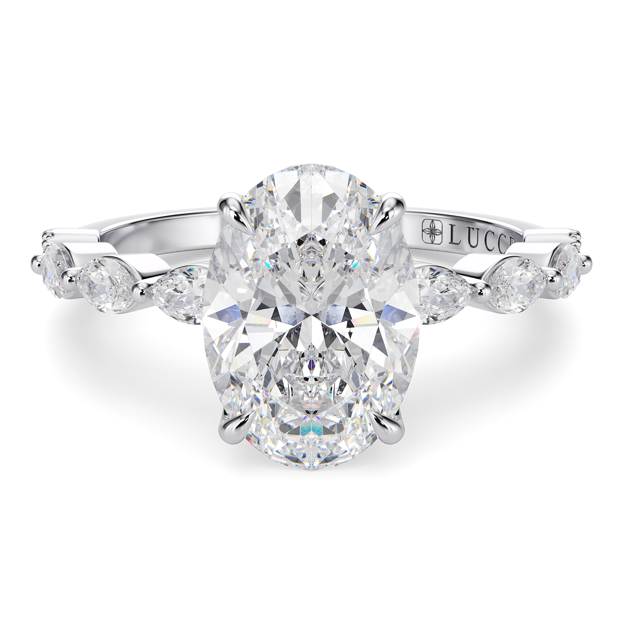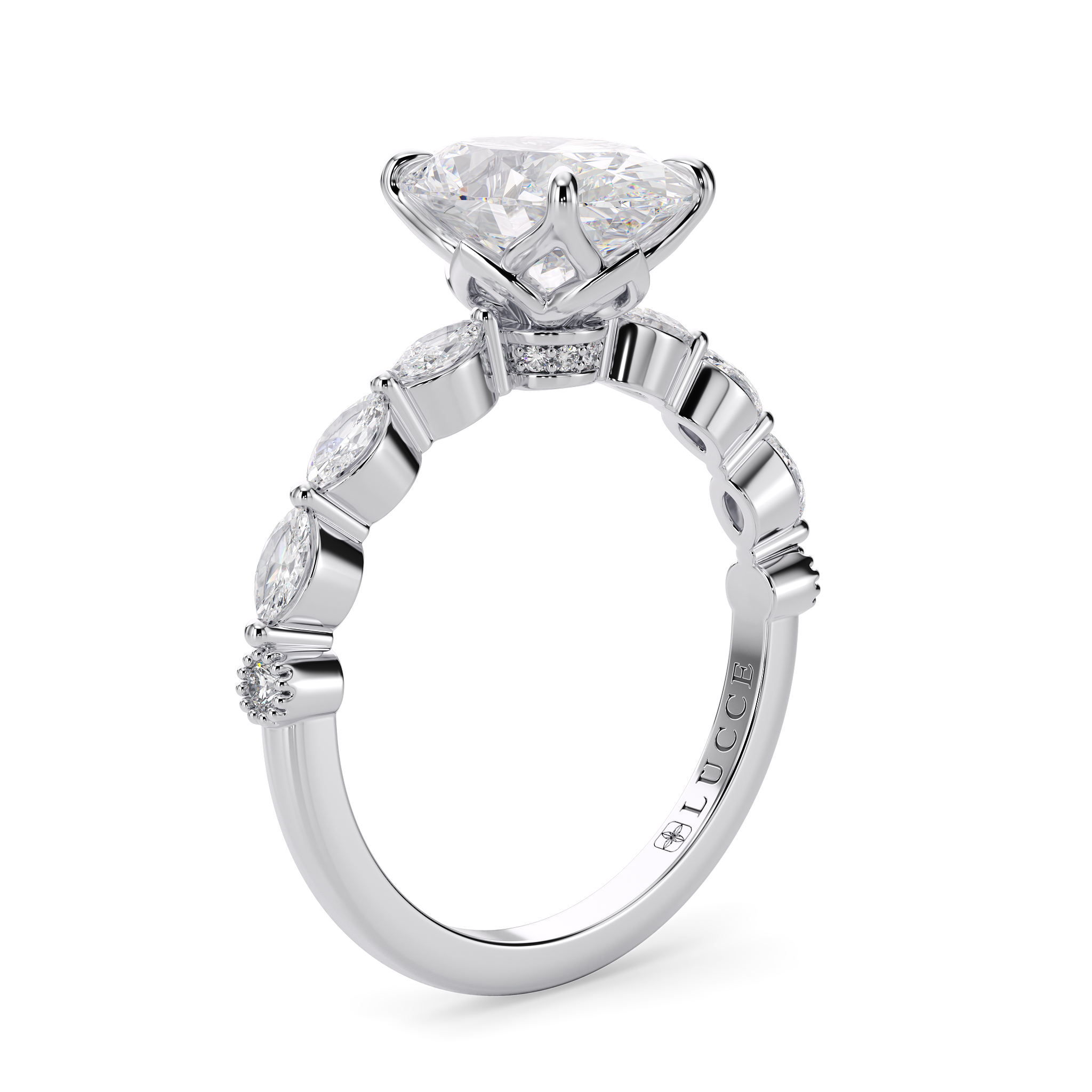 This forever piece showcases a modern marquise cluster setting with delicate petals prongs, forming a graceful floral silhouette. This oval cut diamond engagement ring's marquise accents resemble tender leaves, while end of the band is adorned with a round-cut milgrain dew drops, evoking a freshness of a blooming garden. This ring is a symbol of love that blooms, and a promise to grow and flourish together, always.