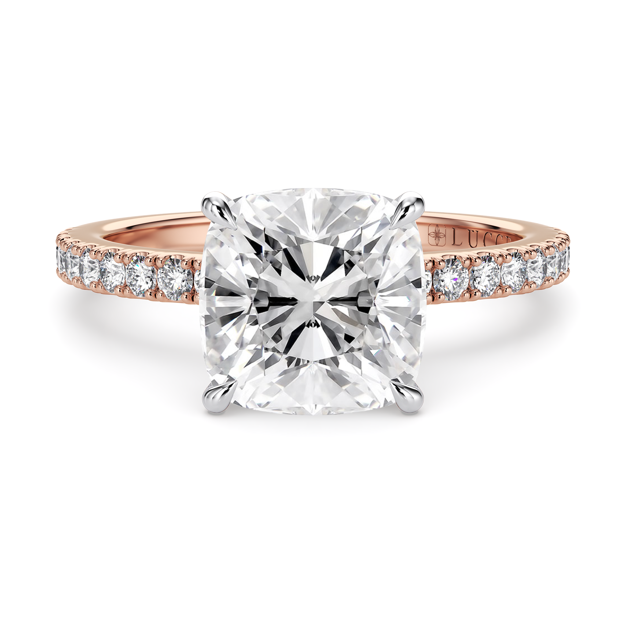 This forever piece features a uniquely wrapped hidden halo and a pavé band. From the top, this cushion cut diamond engagement ring appears simple and elegant, but from another angle, a hidden sparkle is revealed, just like her and the quiet depth of the love you share. The wrapped halo symbolizes your heartfelt promise to keep her safe, embraced in your arms and cherished for all the days to come.