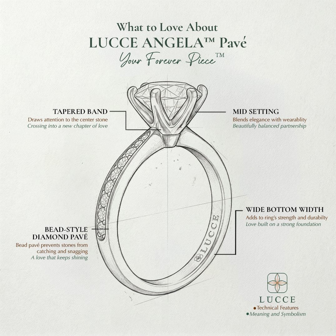 This forever piece is a timeless take on the classic round cut diamond engagement ring. With its classic design and pavé band, it speaks of a love that sees only her; today, tomorrow, and always. It’s a symbol of your promise to choose her, and only her, for the rest of your life. Best paired with the LUCCE ANGELA™ Band.