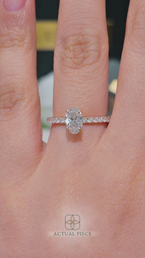This forever piece features delicate petal prongs and a classic pavé band, a design as graceful and captivating as she is. Like her, its beauty isn’t loud; it blooms softly, effortlessly, like a flower kissed by morning light. This oval cut diamond engagement ring's pavé accents shimmer gently, just like the true and steady love you’ve nurtured together.