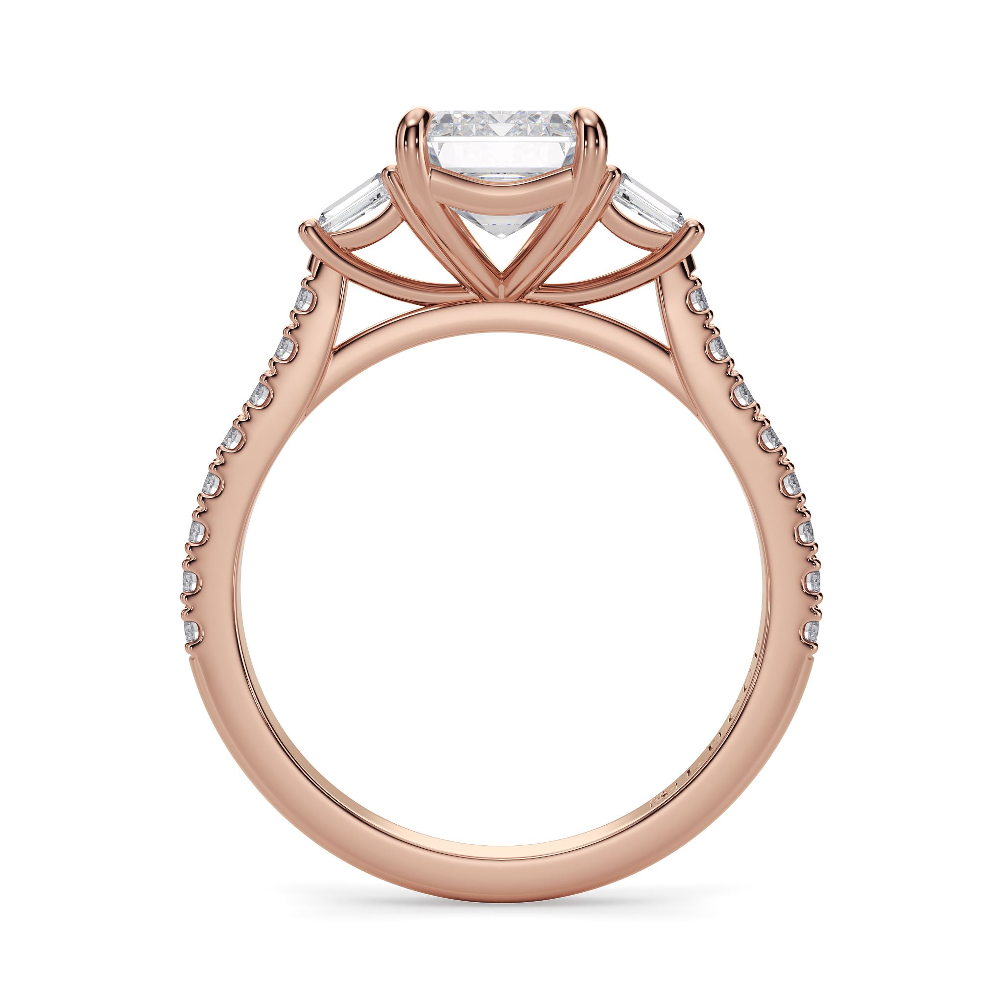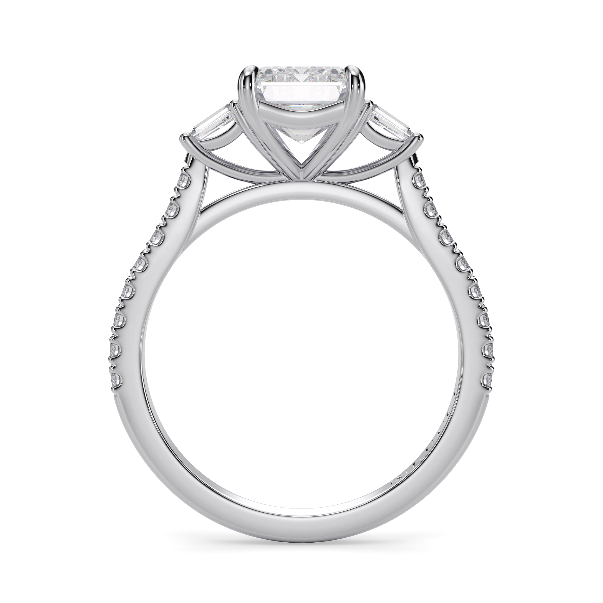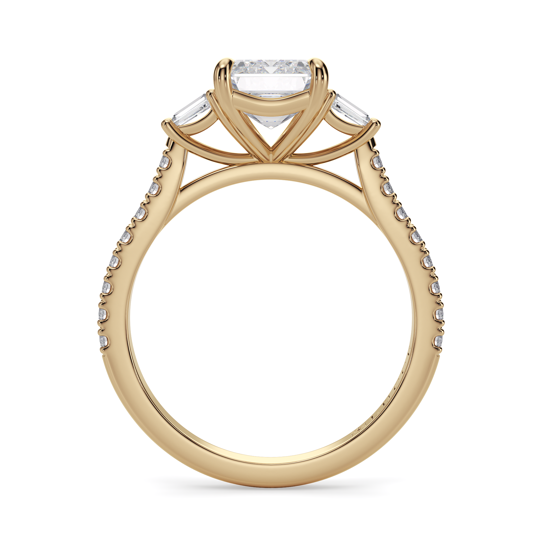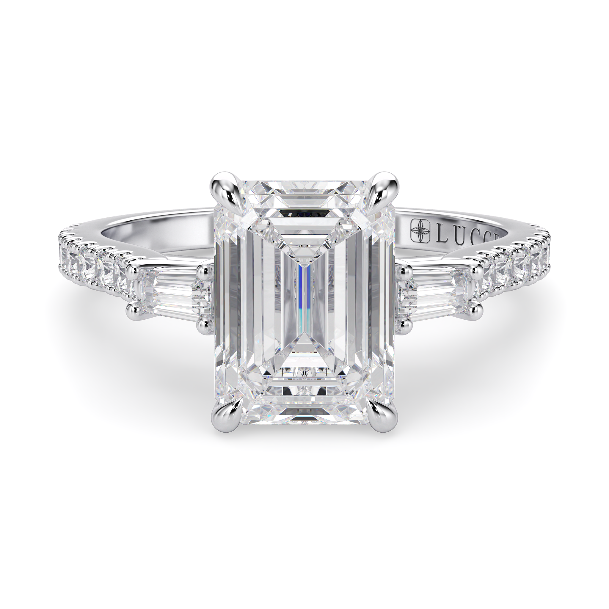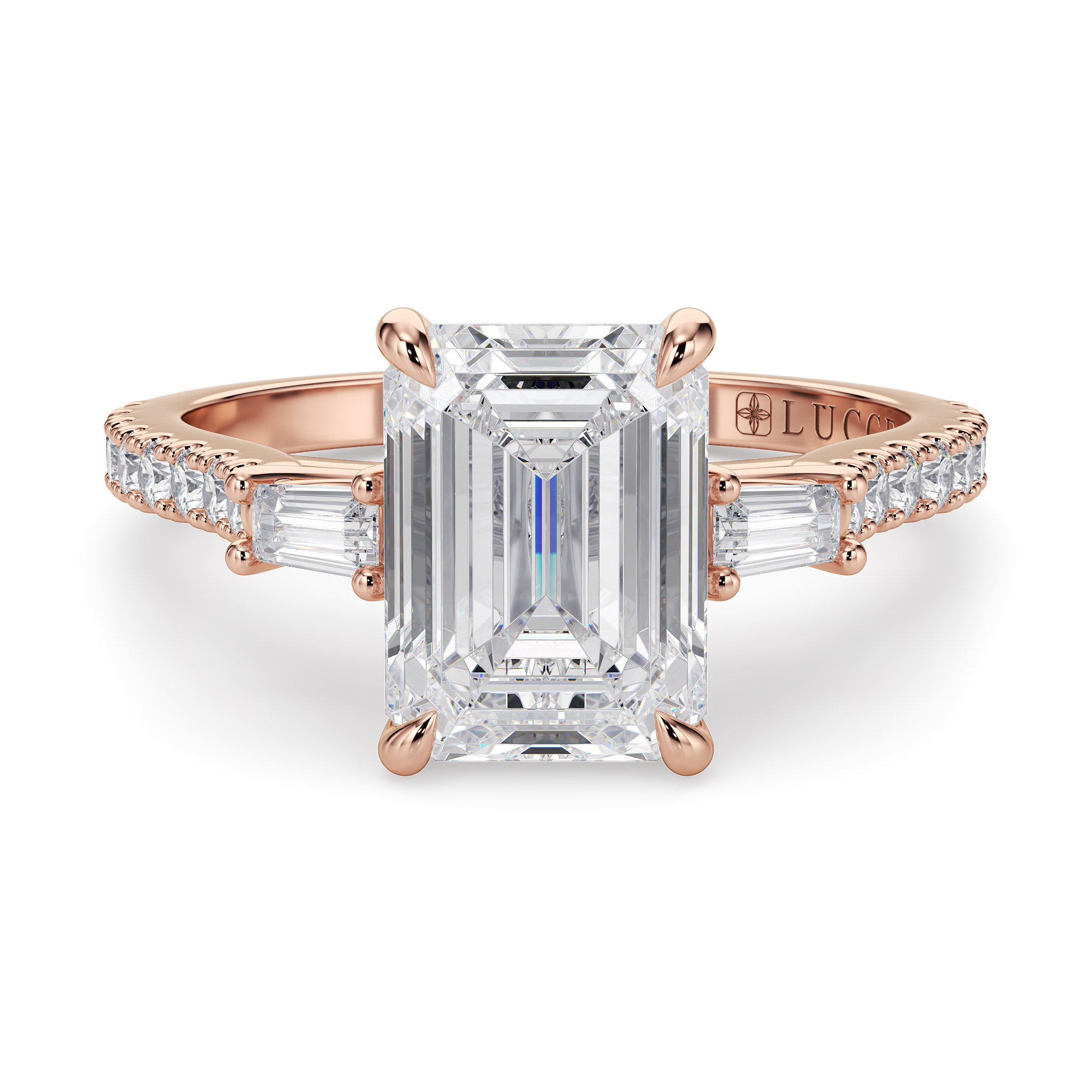 This forever piece is Lucce’s modern take on the timeless three-stone ring with a pavé band. The emerald cut engagement ring's trio of diamonds blooms like a bouquet, each stone representing the love you’ve shared in the past, share in the present, and will share in the future. It’s like saying I love you, not just once, but as a promise you’ll keep whispering for a lifetime.