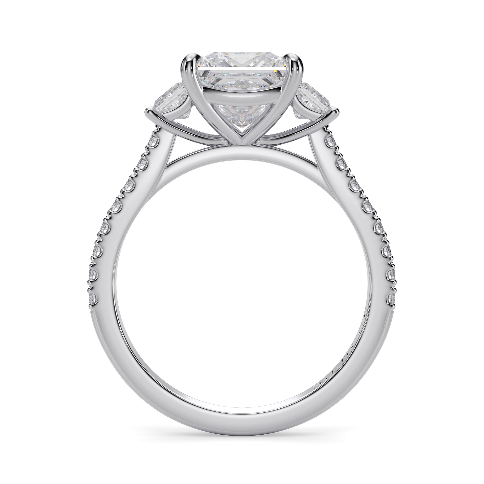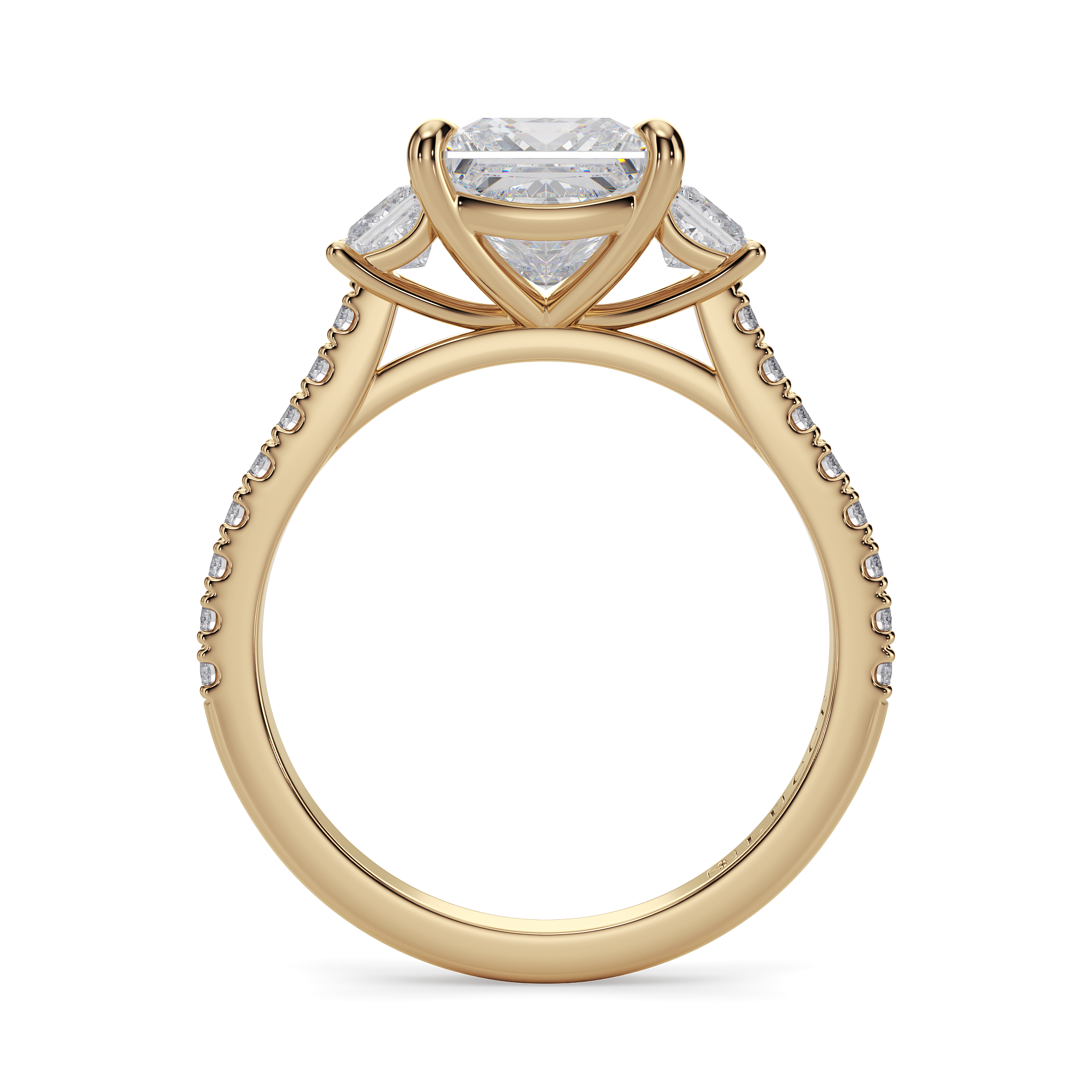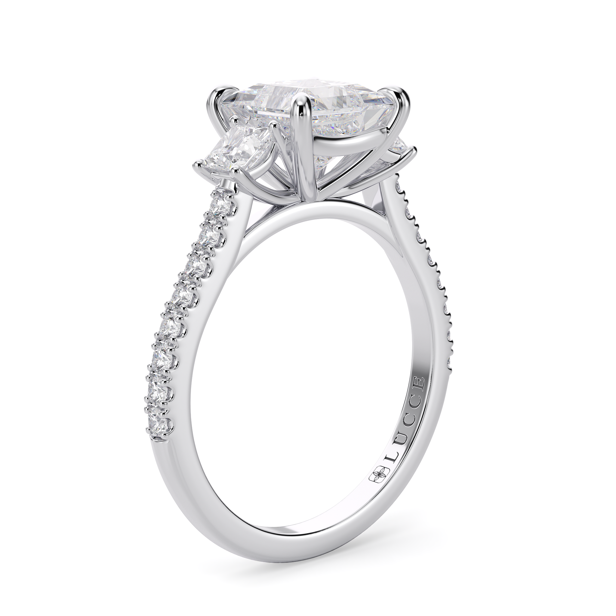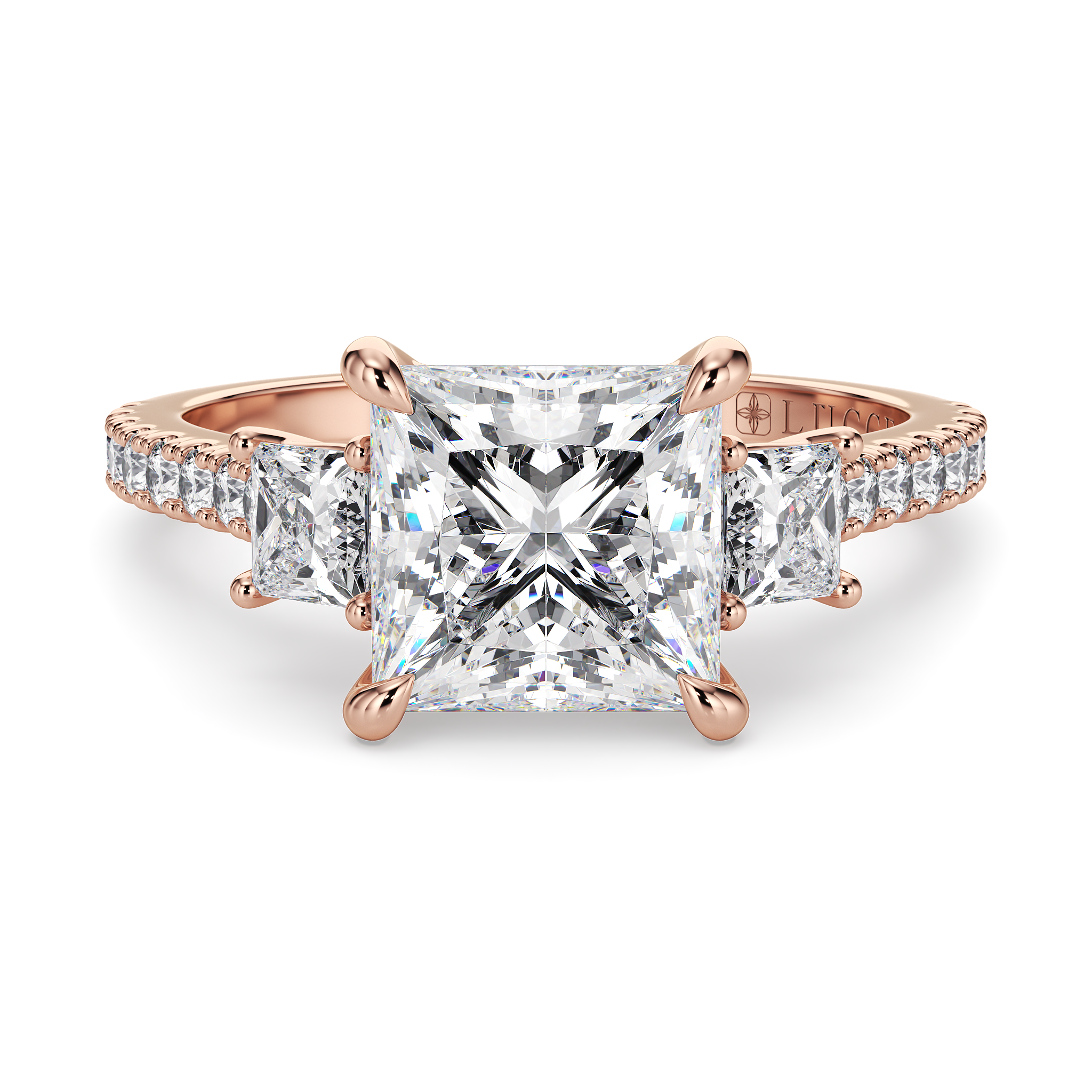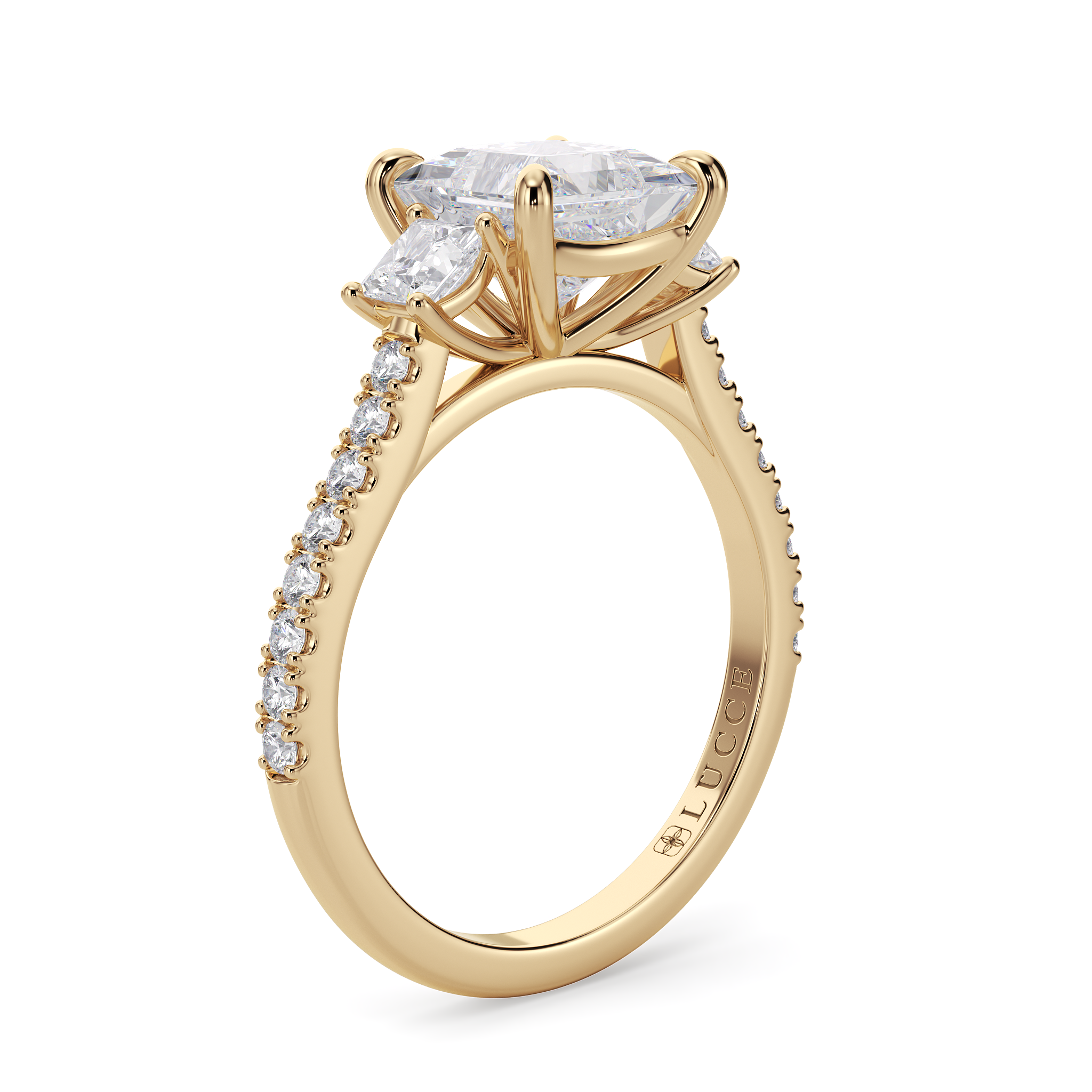 This forever piece is Lucce’s modern take on the timeless three-stone ring with a pavé band. The princess cut engagement ring's trio of diamonds blooms like a bouquet, each stone representing the love you’ve shared in the past, share in the present, and will share in the future. It’s like saying I love you, not just once, but as a promise you’ll keep whispering for a lifetime.
