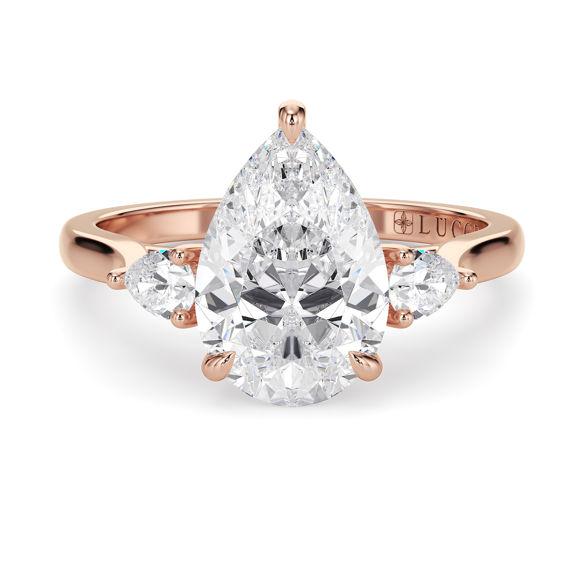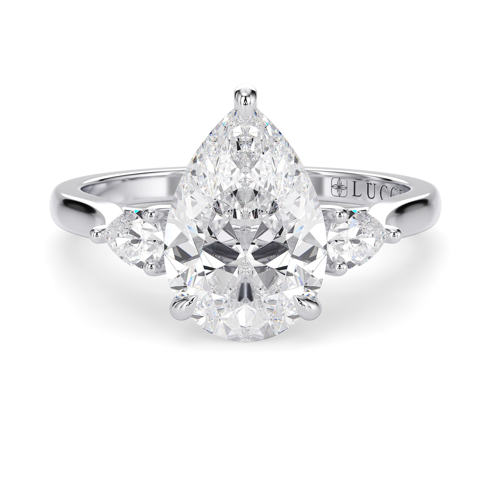 This forever piece is Lucce’s modern take on the timeless three-stone ring. This Pear cut engagement ring's trio of diamonds blooms like a bouquet, each stone representing the love you’ve shared in the past, share in the present, and will share in the future. It’s like saying I love you, not just once, but as a promise you’ll keep whispering for a lifetime.