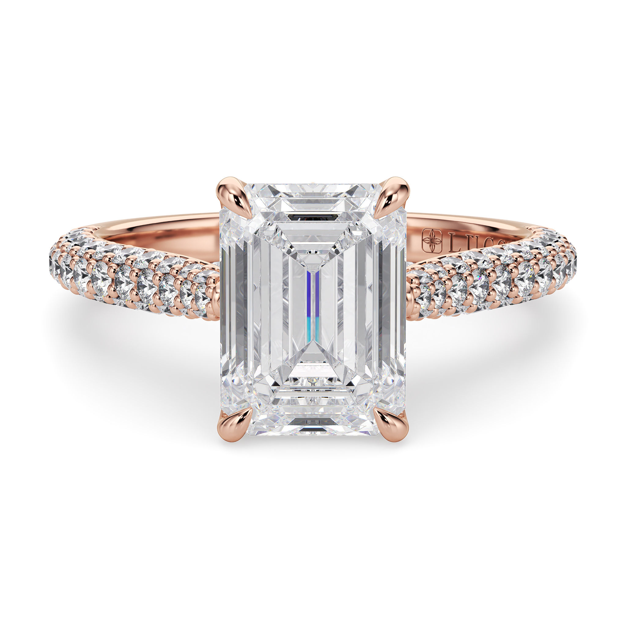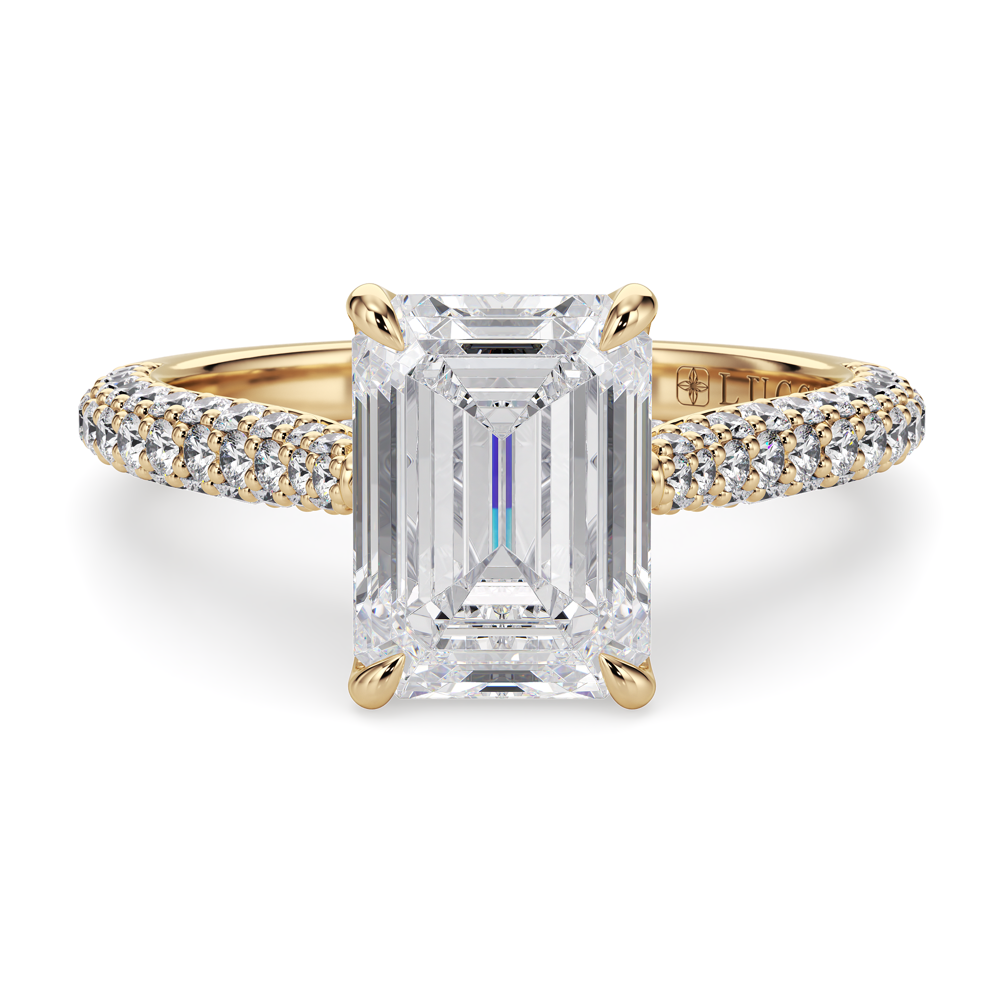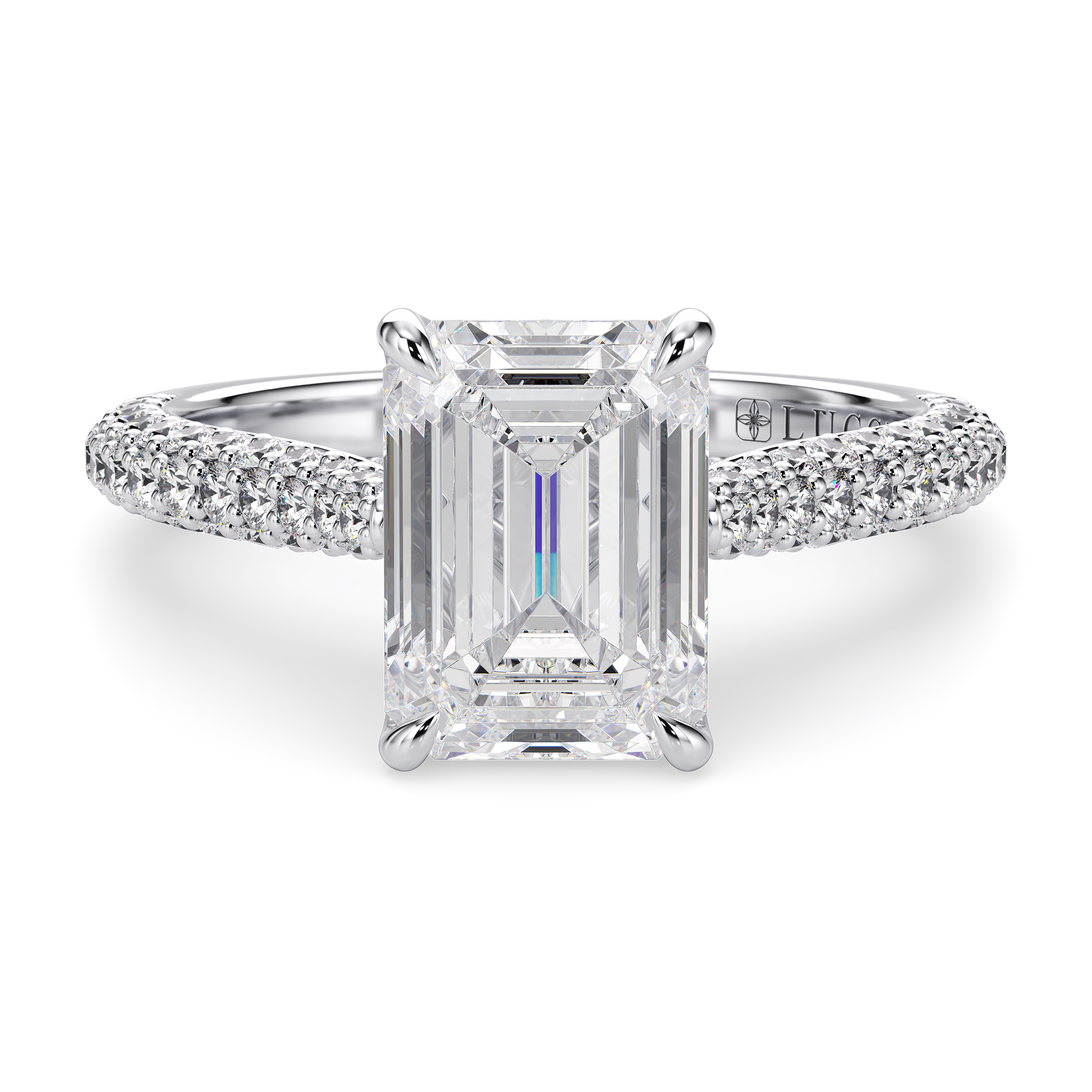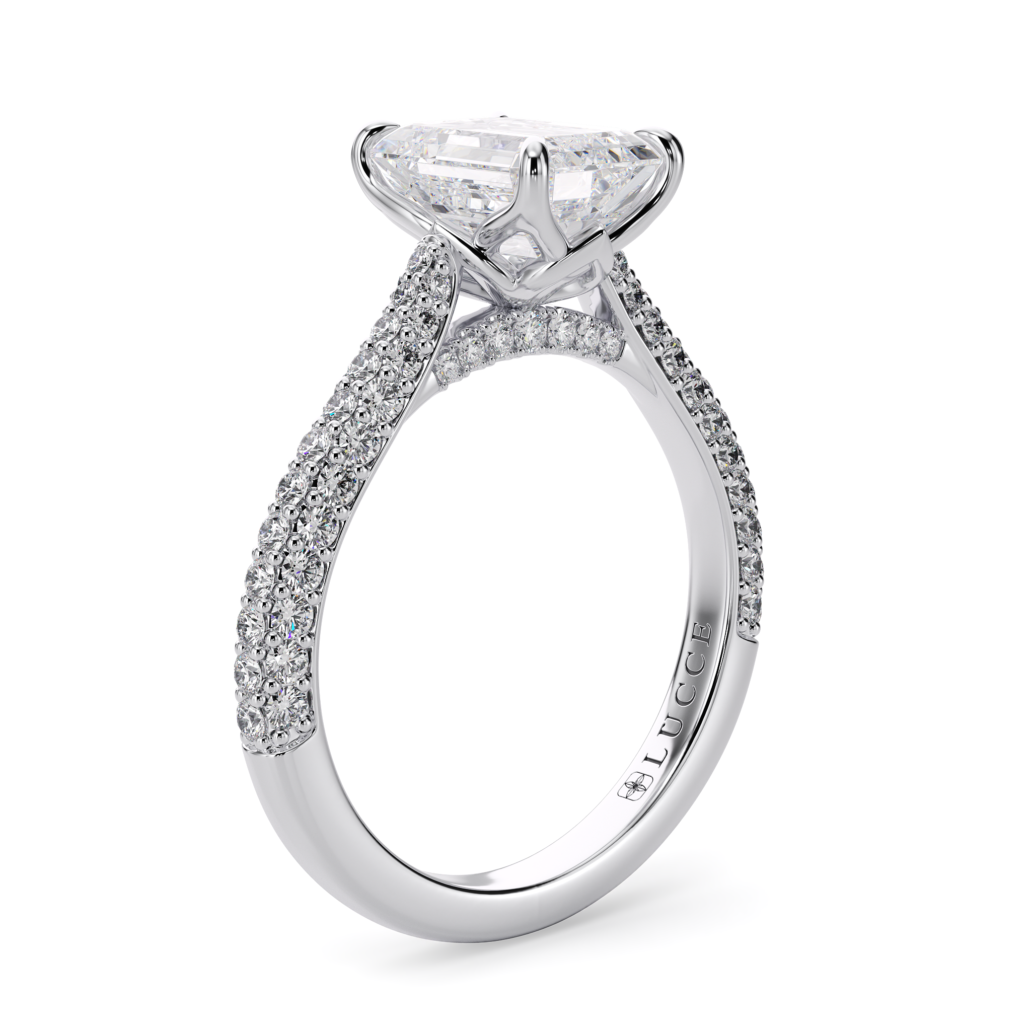 This forever piece is crafted with meaningful details, perfect for an unforgettable proposal. This emerald cut diamond engagement ring features a radiant tri-row band, a graceful cathedral setting with tapered bridge accents, and Lucce’s signature petal prongs. The tri-row band sparkles from every angle, just like her, beautiful in every way you see her. This ring speaks of a love that says she deserves everything, and of your heartfelt promise to give her nothing less than your all.