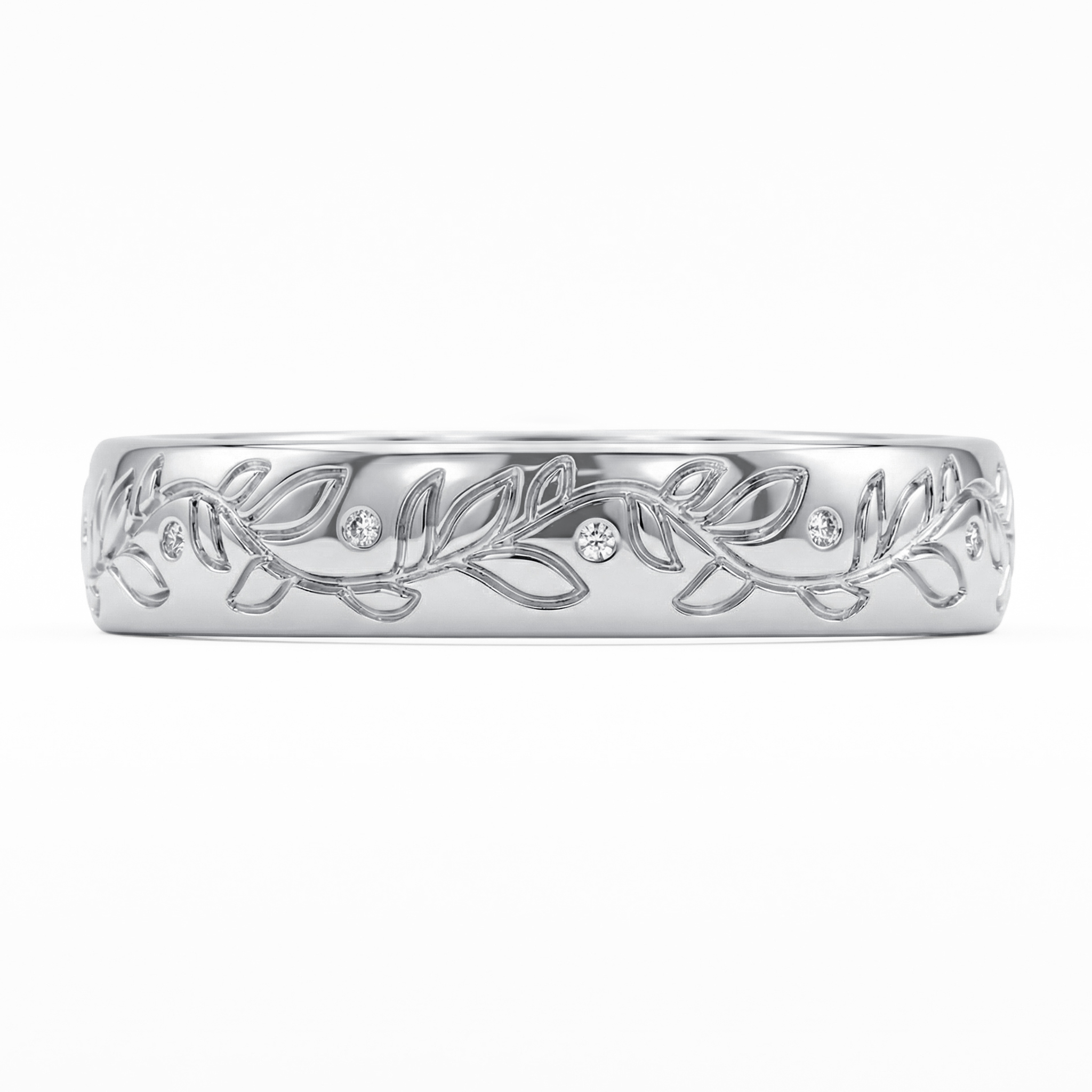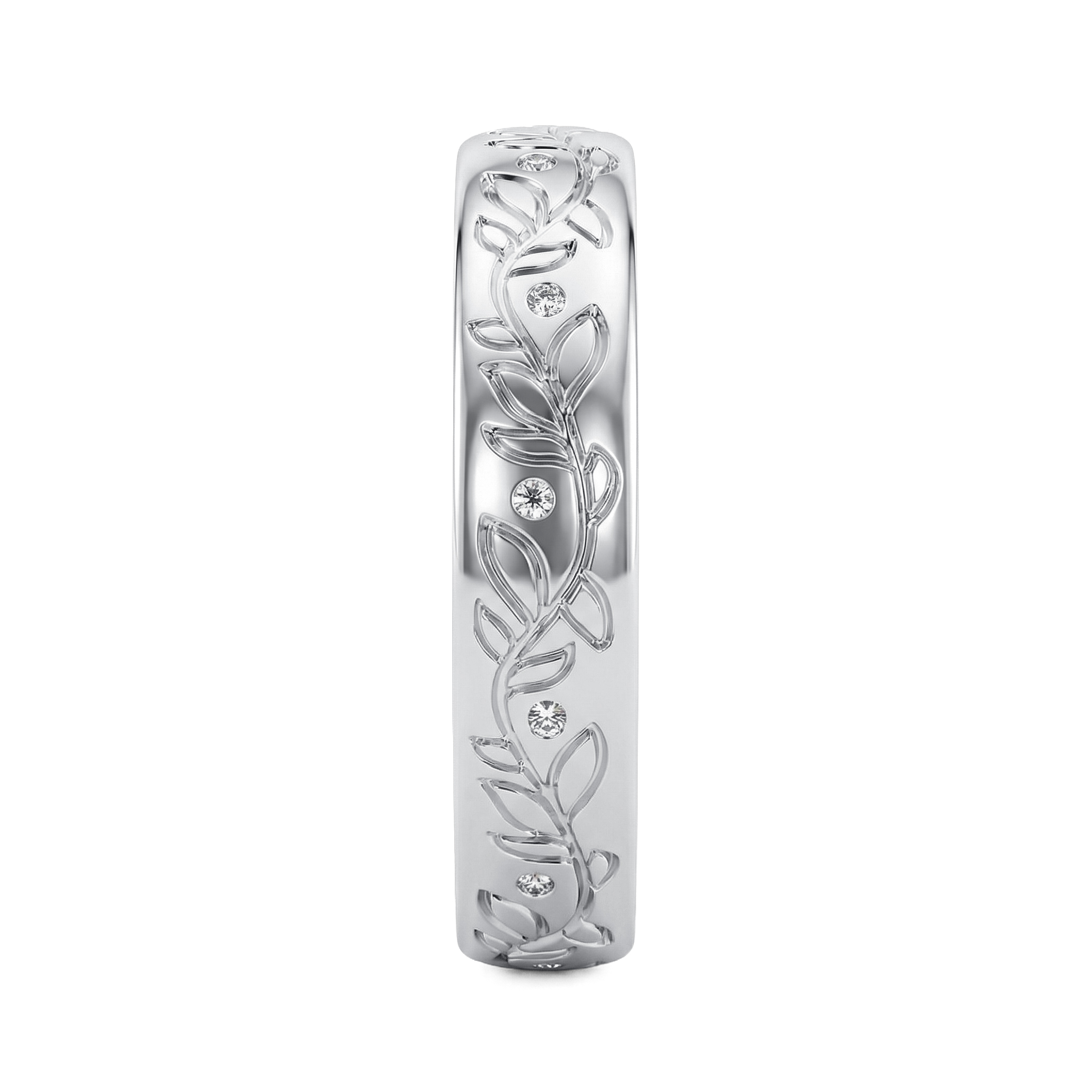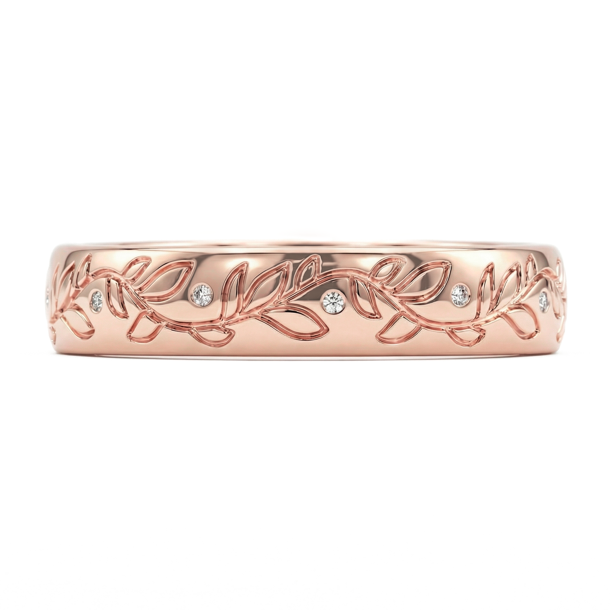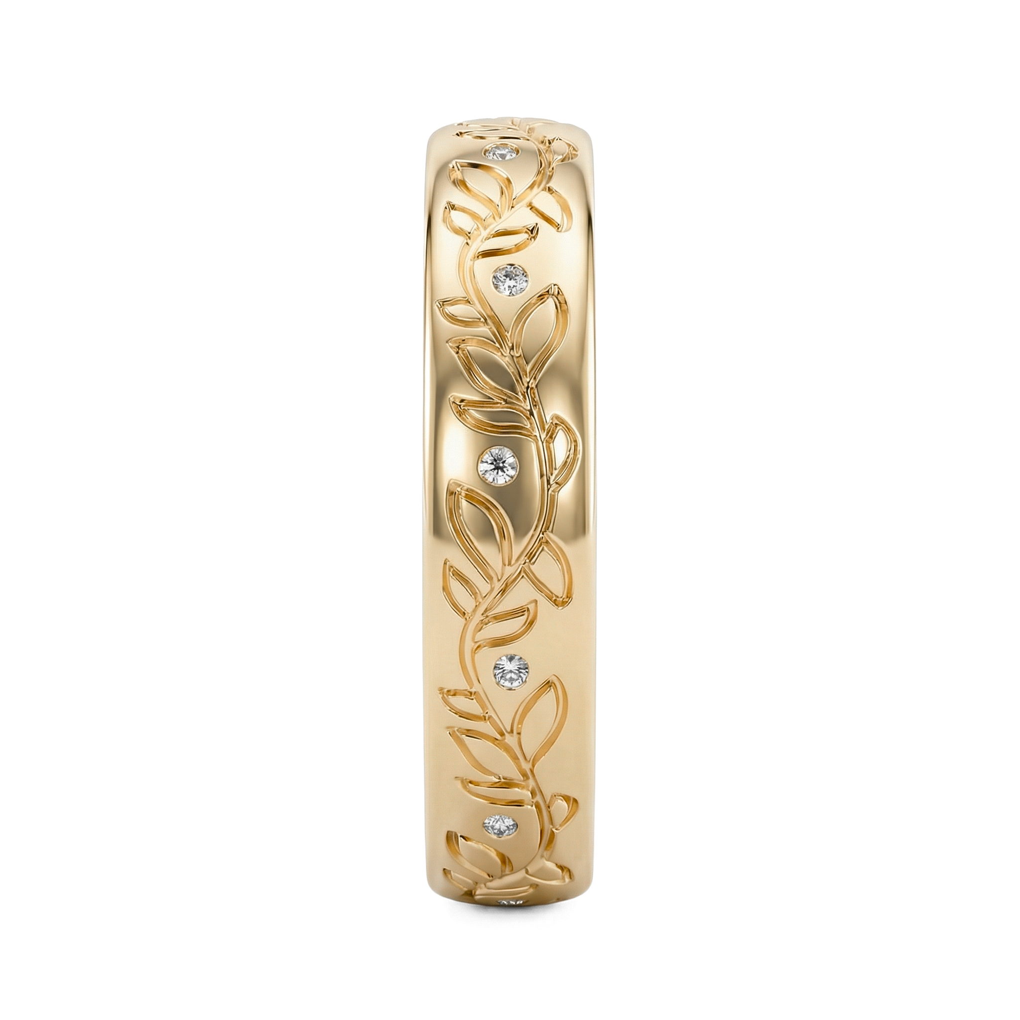 This forever piece features a dome-shaped band with a continuous line of leaf carvings, symbolizing a love that's beautifully connected, from promise to forever. Inspired by the striking leaves of the Ecuadorian Rose, each mark and embedded diamond embodies the depth of your love: bold in its presence, steady through time and breathtaking in every season. Best paired with the LUCCE ECUADORIAN™ Fili Chevron.