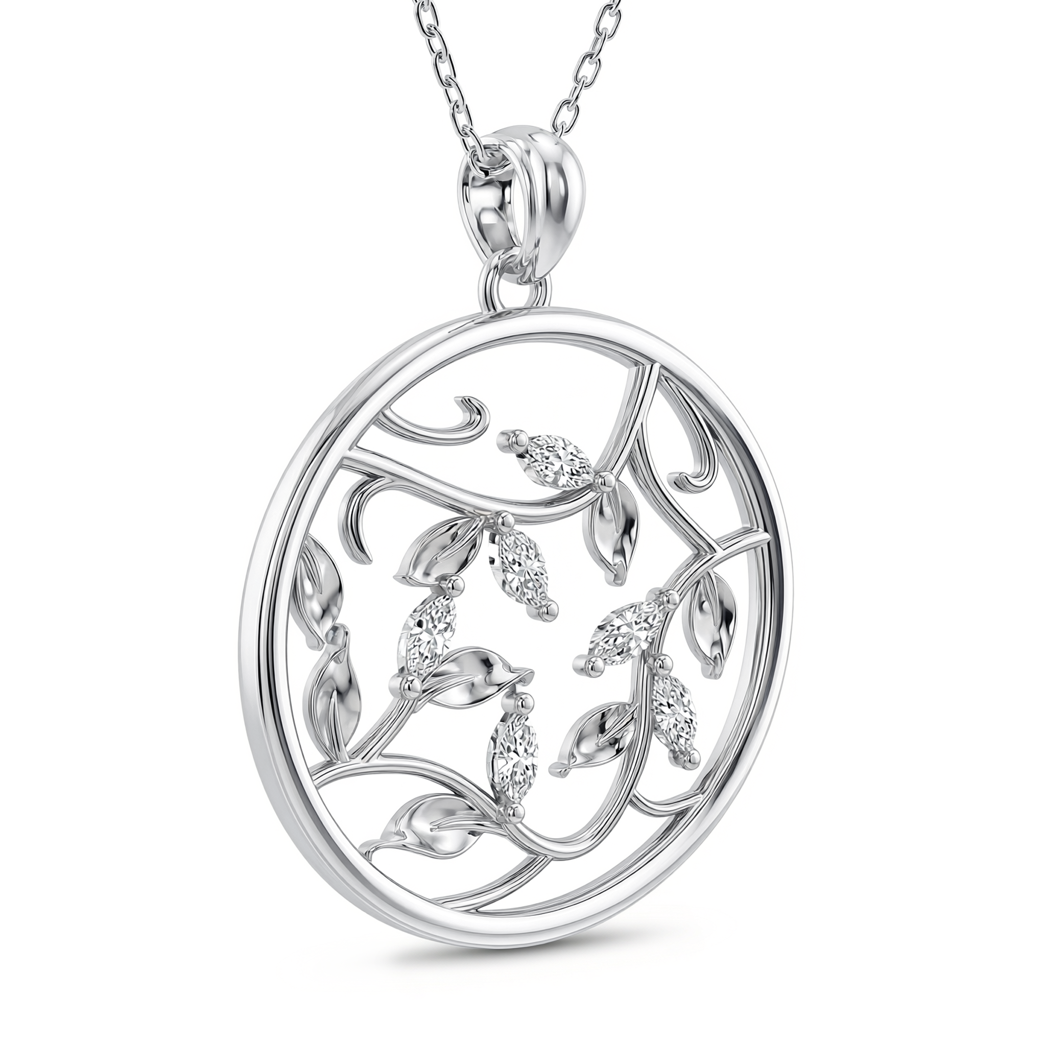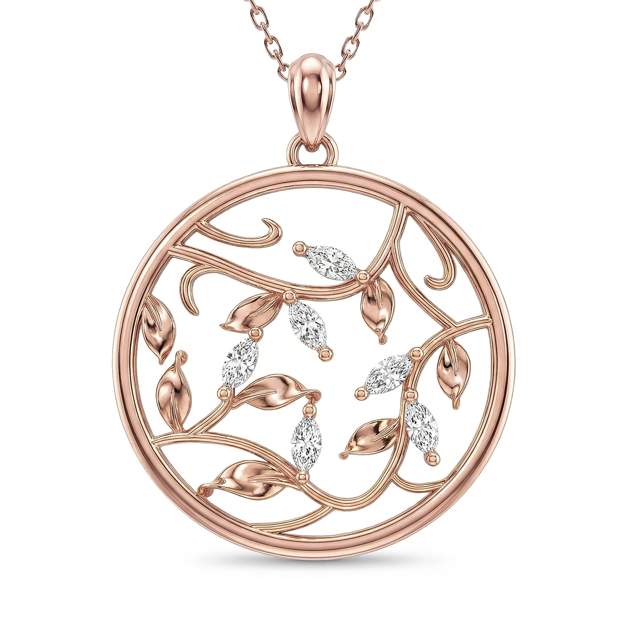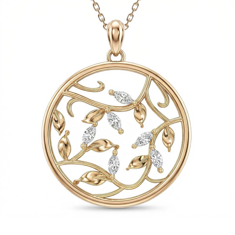 This forever piece features a circular pendant with marquise cut leaves, symbolizing a love that's beautifully connected, from promise to forever. Inspired by the striking leaves of the Ecuadorian Rose, this diamond necklace reflects the depth of your love: bold in its presence, steady through time, and breathtaking in every season.