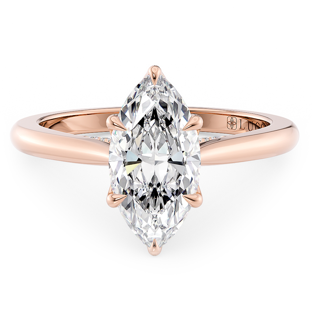 This forever piece features a solitaire cathedral setting with an accented tapered bridge and delicate petal prongs. This marquise cut diamond engagement ring is like a singular, delicate flower, offered to the one your heart cherishes most. The cathedral’s graceful arcs lift toward the petals, symbolizing how you see her, your queen, radiant and blossoming. The tapered bridge reflects the journey you share, as you cross into a new chapter of love, hand in hand.