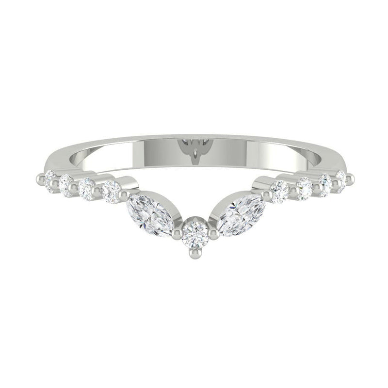 At its heart lies a stunning arrangement of marquise and round moissanite, meticulously placed to create a mesmerizing contoured design. The contoured shape of this band not only adds a touch of uniqueness but also enhances comfort, allowing it to sit seamlessly alongside any engagement ring. Whether worn alone or paired with other bands, it effortlessly complements any style with its subtle yet striking presence.