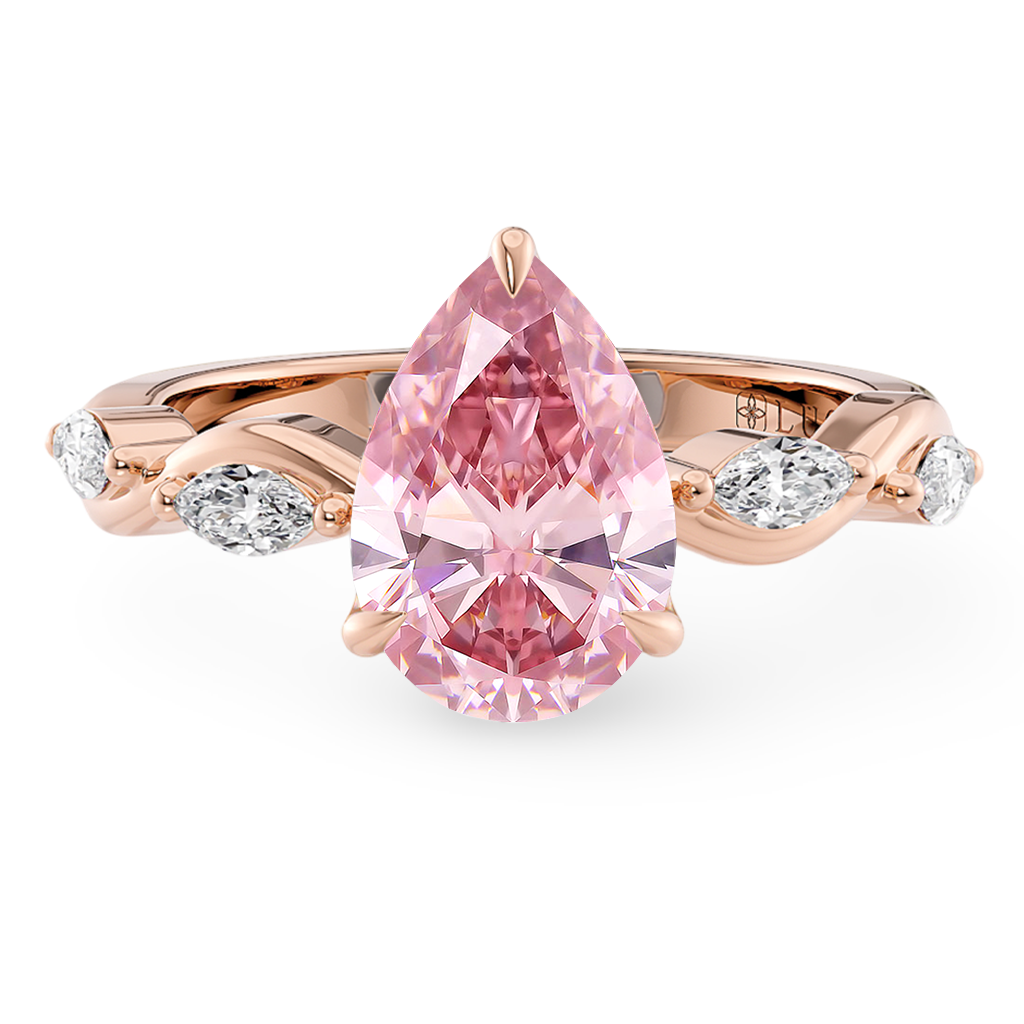 This forever piece features Lucce’s signature petal prongs and marquise-cut diamonds nestled in graceful, twisting vines. This pear cut pink diamond engagement ring's delicate petal prongs symbolize her beauty, like a flower in eternal bloom, capturing the grace, warmth, and gentle strength that make her truly unforgettable. The marquise diamonds in twisting vines form an infinity design, representing a love that is forever true and constant through all times.