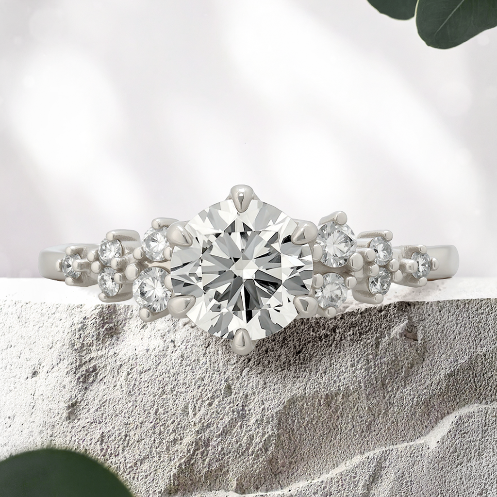 This forever piece features a delicate cluster setting with Lucce's signature petal prongs, forming a bloom of scattered blossoms. This round cut diamond engagement ring's cluster of stones also symbolizes the beautiful differences between you, each unique, yet coming together in perfect harmony. This ring symbolizes your promise to stay with her because your love is beautifully real.