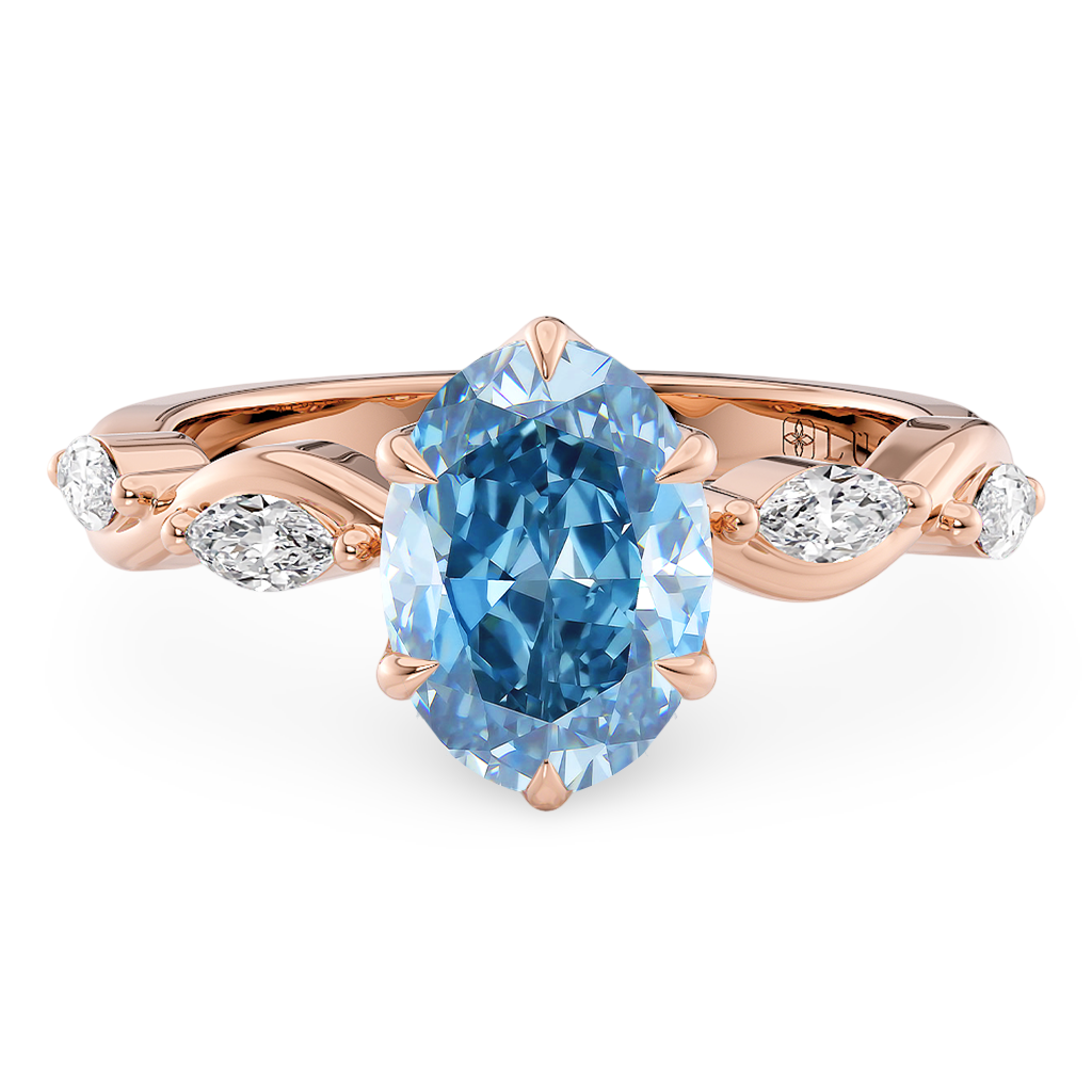 This forever piece features Lucce’s signature petal prongs and marquise-cut diamonds nestled in graceful, twisting vines. This oval cut blue diamond engagement ring's six delicate petal prongs symbolize her beauty, like a flower in eternal bloom, capturing the grace, warmth, and gentle strength that make her truly unforgettable. The marquise diamonds in twisting vines form an infinity design, representing a love that is forever true and constant through all times.