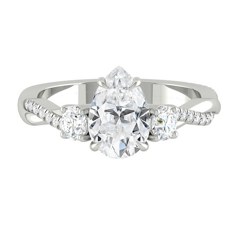 This forever piece showcases a graceful medley of a three-stone setting and a delicately twisting band. This pear cut diamond engagement ring's trio of stones blooms like a bouquet of flowers, each gem representing the love you've shared in the past, share in the present, and will share in the future. The vine-like band gently weaves around them, symbolizing two lives intertwined by love, forming an infinity that speaks of a bond that is unbreakable.