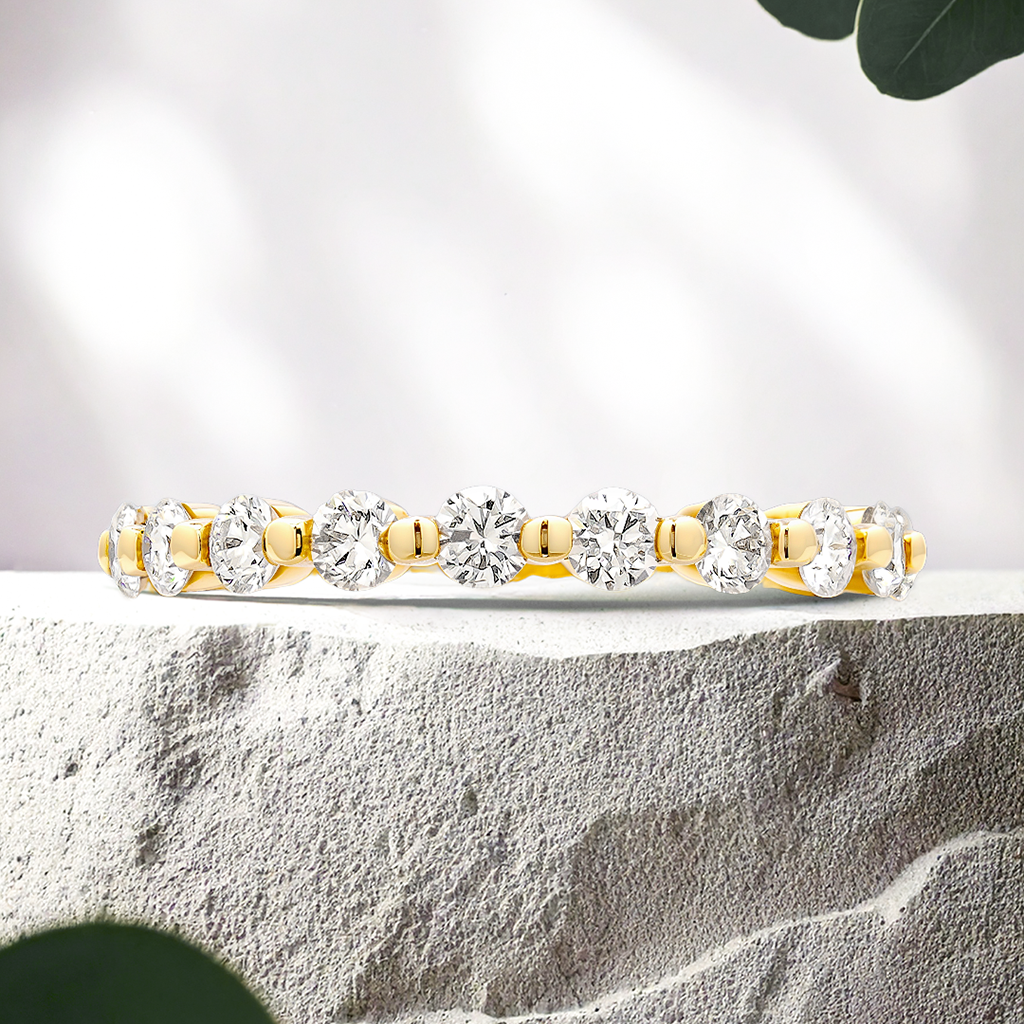 Floating shared prong gemstones shimmer from the top half of this delicate and dazzling wedding band for a spectacular look.