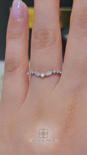 At its heart lies a stunning arrangement of marquise and round lab grown diamonds, meticulously placed to create a mesmerizing contoured design. The contoured shape of this band not only adds a touch of uniqueness but also enhances comfort, allowing it to sit seamlessly alongside any engagement ring. Whether worn alone or paired with other bands, it effortlessly complements any style with its subtle yet striking presence.