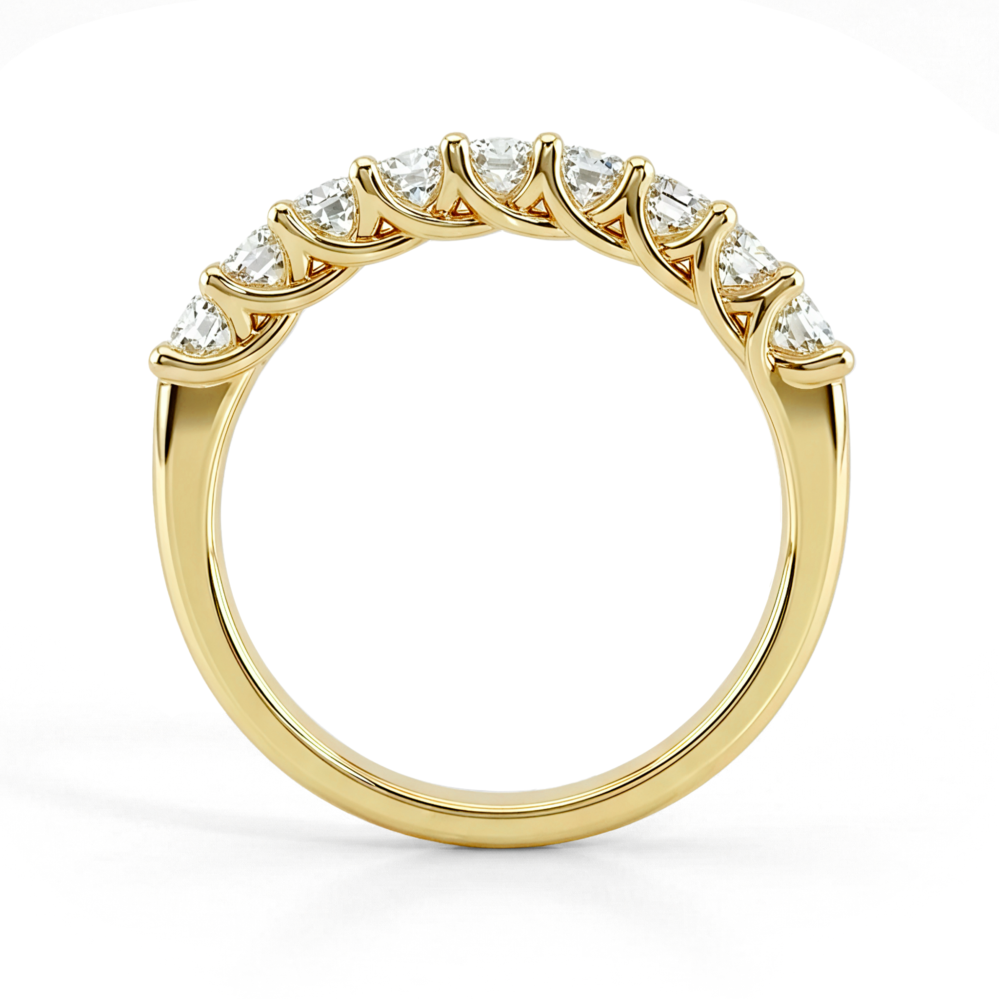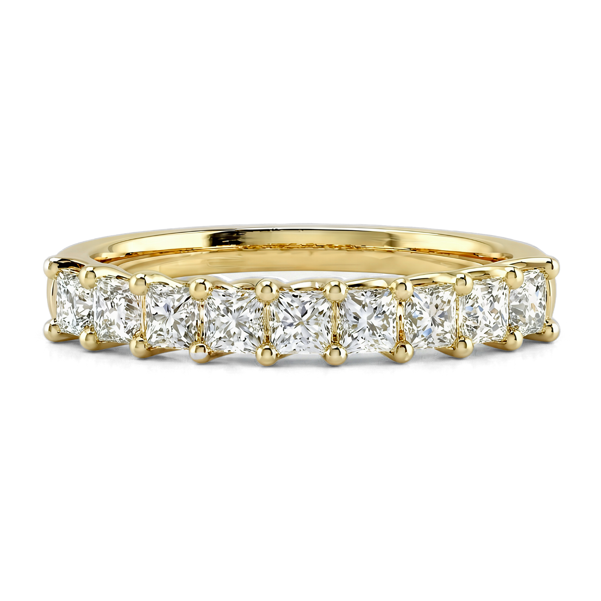 This timeless Eternity ring in Princess cut showcases the pure brilliance of the gemstones in refined trellis settings. A perfect ring that suits any occasion.
