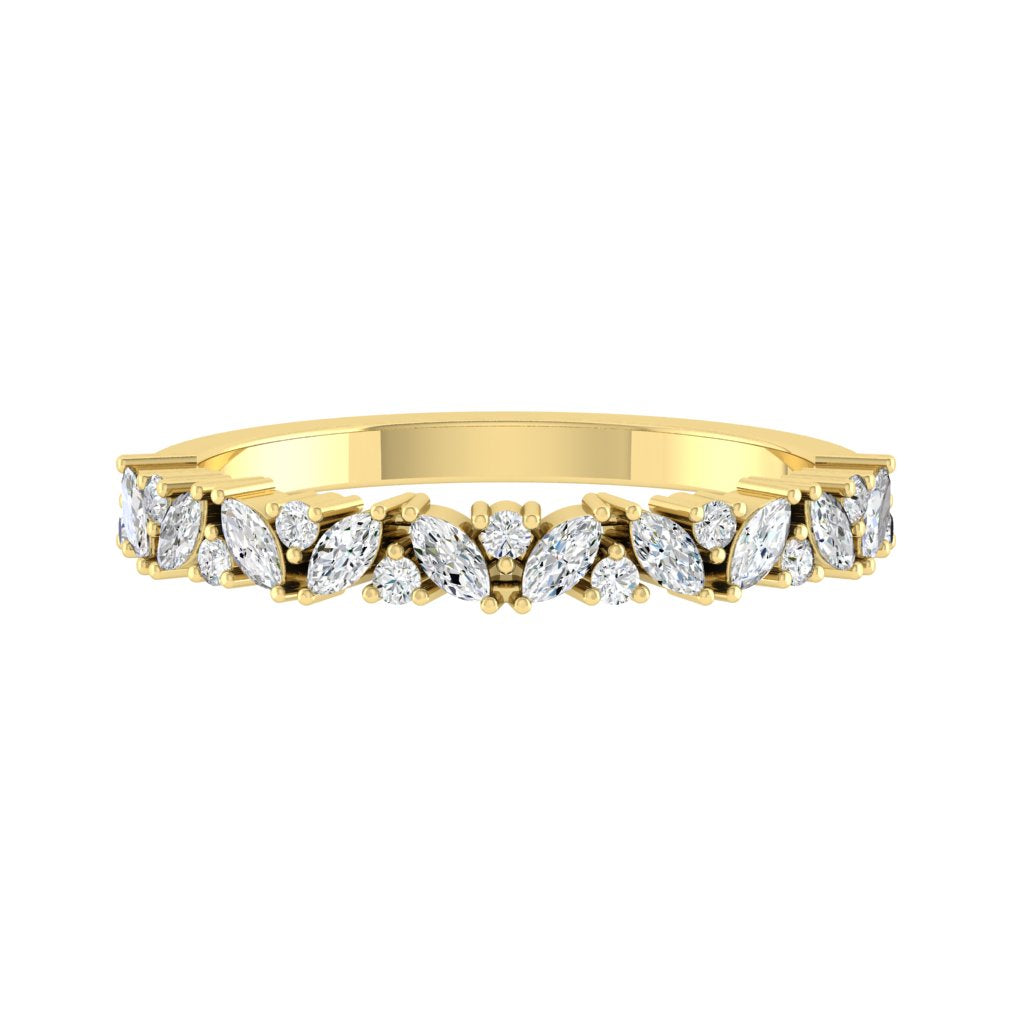 This brilliant half-eternity interwoven band of marquise and round cut stones brings these two different cuts into a beautiful harmony.
