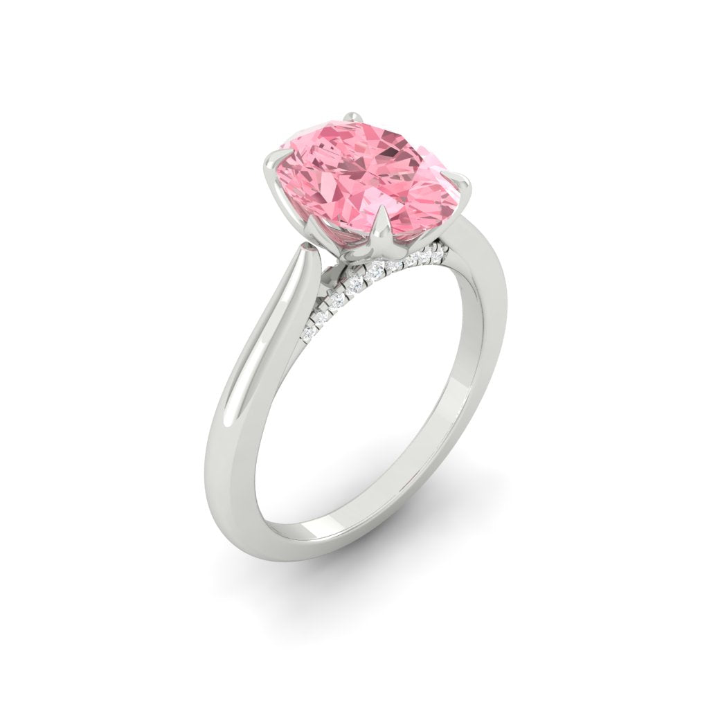 This forever piece features a solitaire cathedral setting with an accented tapered bridge and delicate petal prongs. This oval cut pink diamond engagement ring is like a singular, delicate flower, offered to the one your heart cherishes most. The cathedral’s graceful arcs lift toward the petals, symbolizing how you see her, your queen, radiant and blossoming. The tapered bridge reflects the journey you share, as you cross into a new chapter of love, hand in hand.