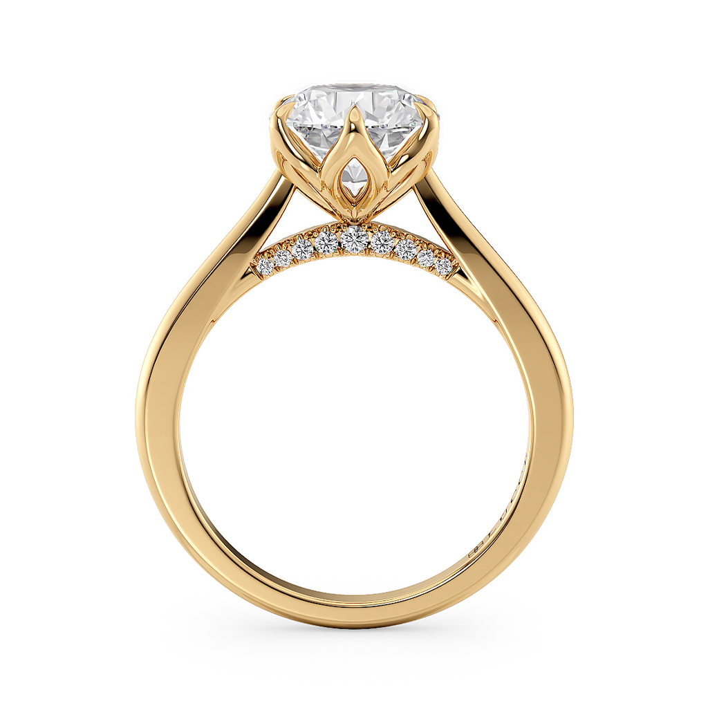 This forever piece features a solitaire cathedral setting with an accented tapered bridge and delicate petal prongs. This round cut diamond engagement ring is like a singular, delicate flower, offered to the one your heart cherishes most. The cathedral’s graceful arcs lift toward the petals, symbolizing how you see her, your queen, radiant and blossoming. The tapered bridge reflects the journey you share, as you cross into a new chapter of love, hand in hand.
