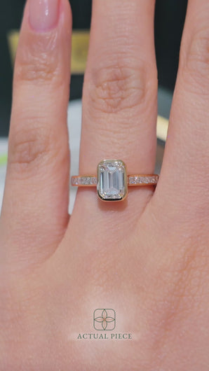 This forever piece is Lucce’s graceful interpretation of an emerald cut diamond engagement ring in a bezel setting. The bezel gently cradles the diamond, symbolizing your promise to protect her with all your heart and hold her close forever. Beneath it, the soft petals unfold, echoing the love that continues to bloom beautifully, nurtured and tenderly safeguarded by your devotion.