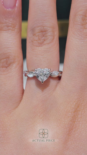 This forever piece features Lucce’s signature petal prongs and marquise-cut diamonds nestled in graceful, twisting vines. This heart cut diamond engagement ring's delicate petal prongs symbolize her beauty, like a flower in eternal bloom, capturing the grace, warmth, and gentle strength that make her truly unforgettable. The marquise diamonds in twisting vines form an infinity design, representing a love that is forever true and constant through all times.