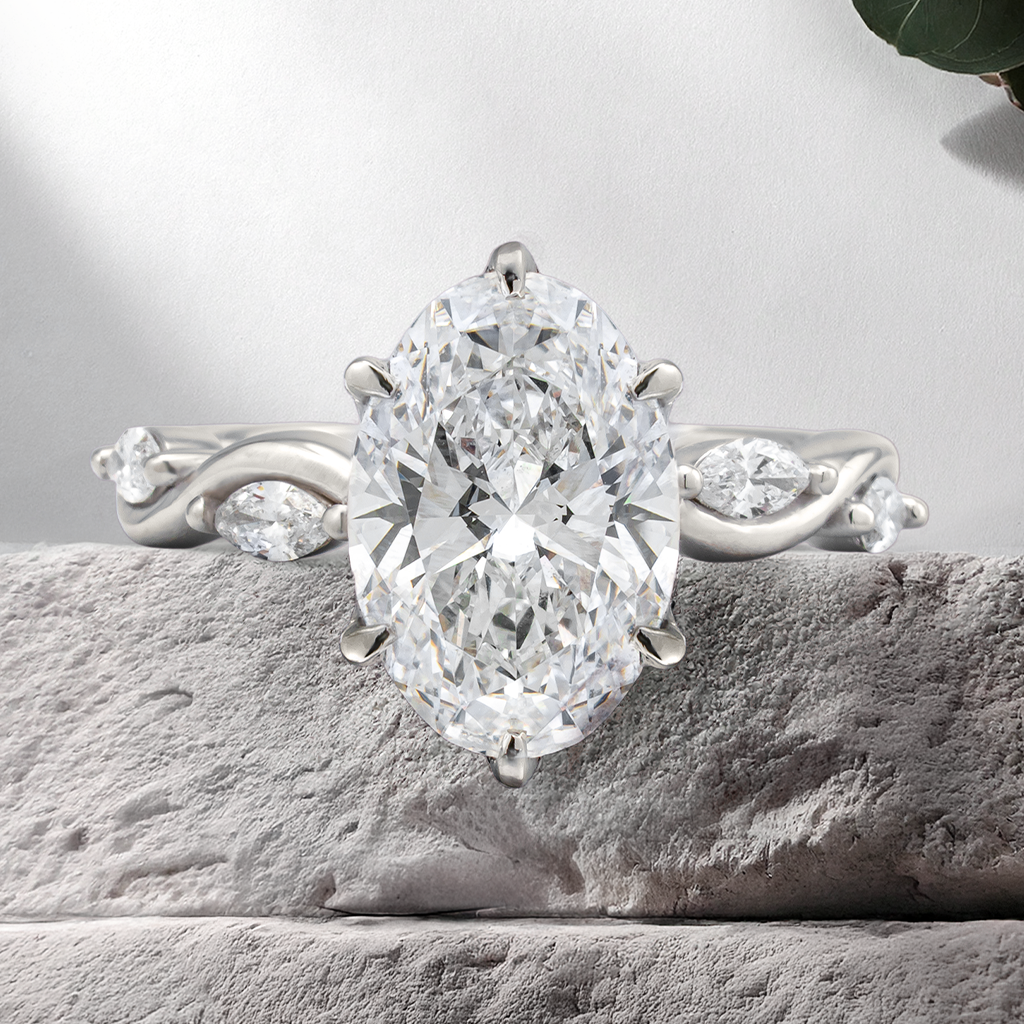 This forever piece features Lucce’s signature petal prongs and marquise-cut diamonds nestled in graceful, twisting vines. This oval cut diamond engagement ring's six delicate petal prongs symbolize her beauty, like a flower in eternal bloom, capturing the grace, warmth, and gentle strength that make her truly unforgettable. The marquise diamonds in twisting vines form an infinity design, representing a love that is forever true and constant through all times.