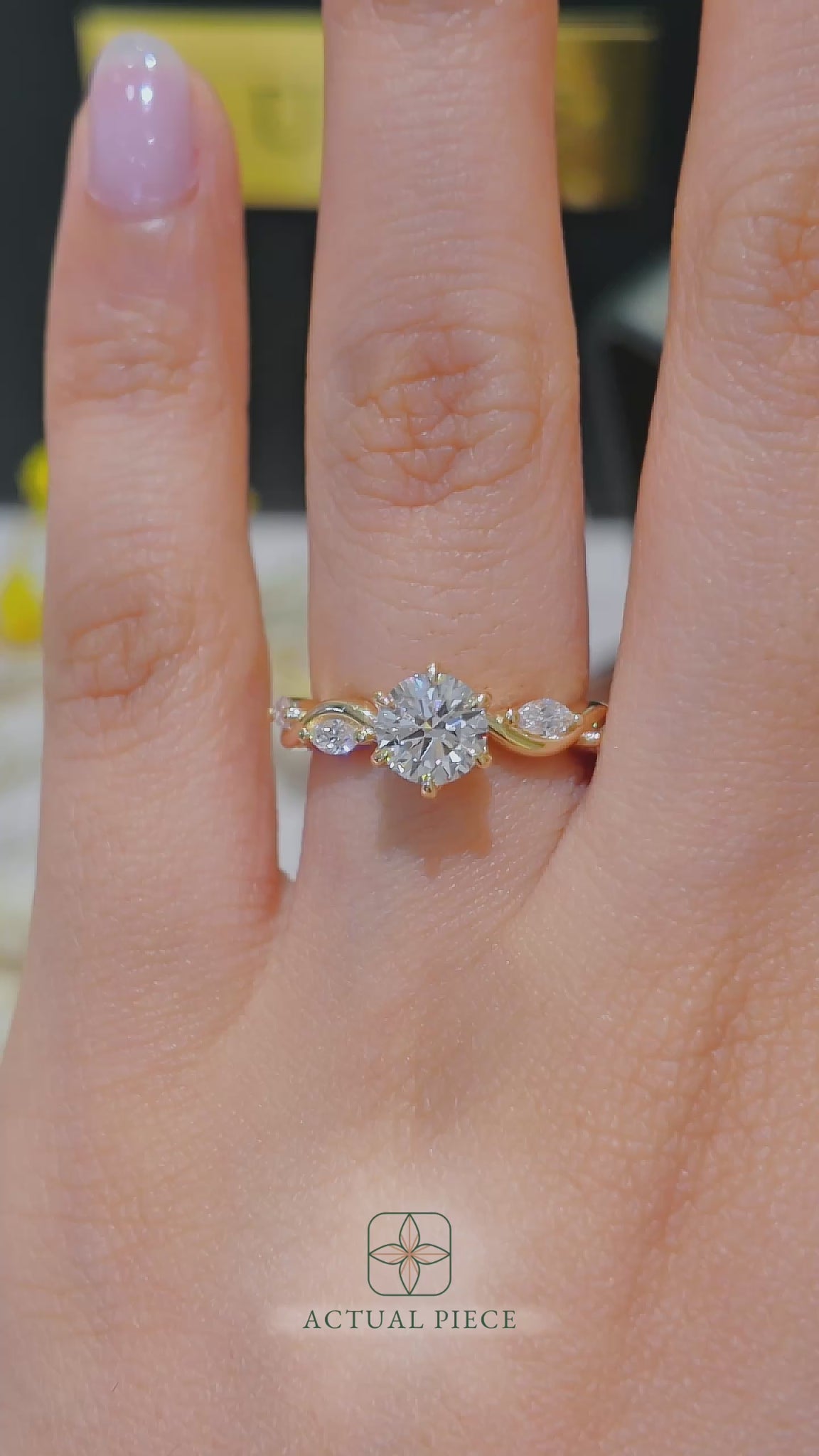 This forever piece features Lucce’s signature petal prongs and marquise-cut diamonds nestled in graceful, twisting vines. This round cut diamond engagement ring's delicate petal prongs symbolize her beauty, like a flower in eternal bloom, capturing the grace, warmth, and gentle strength that make her truly unforgettable. The marquise diamonds in twisting vines form an infinity design, representing a love that is forever true and constant through all times.