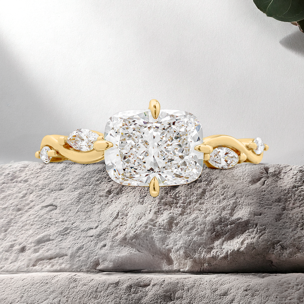 This forever piece features a low profile setting and marquise-cut diamonds nestled in twisting vines, elements that echo Lucce’s iconic emblem. This cushion cut diamond engagement ring's low setting mirrors the kind of love you share, quiet and grounded yet full of depth and meaning. The marquise diamonds in twisting vines form an infinity design, representing a love that is forever true and constant through all times.