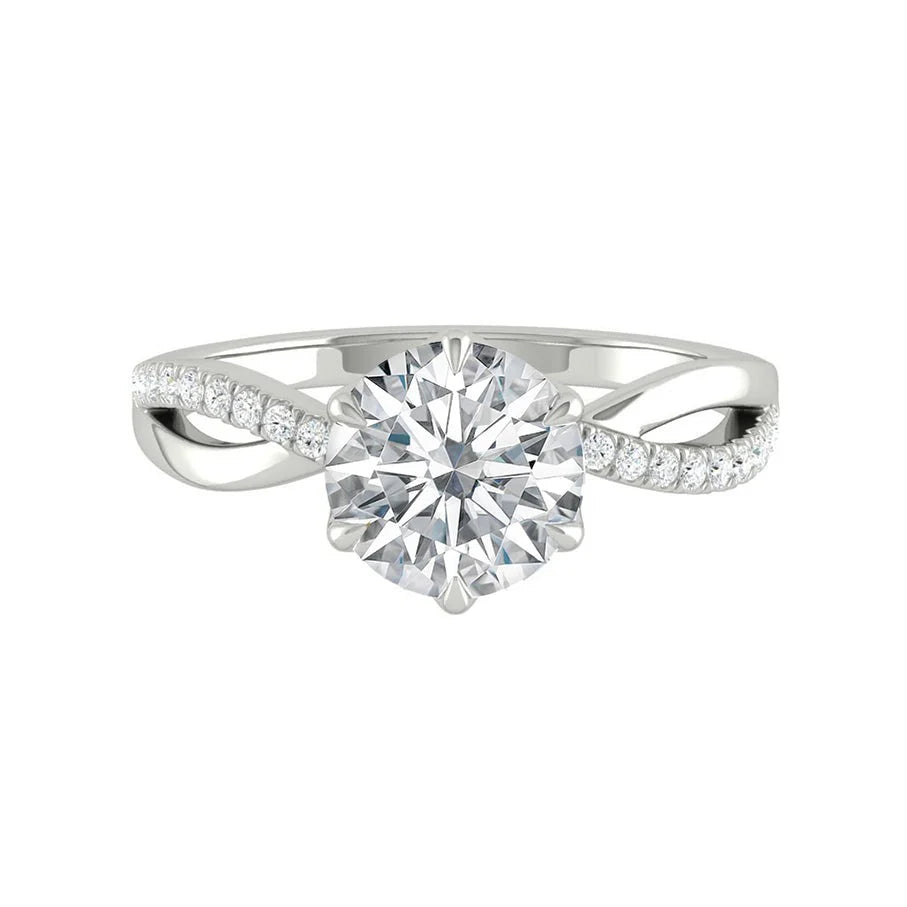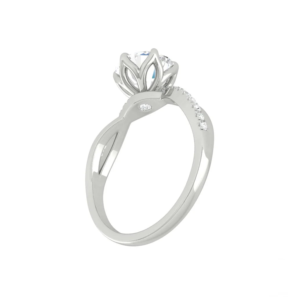 This forever piece features a twisting accented band and Lucce’s signature petal prongs. This round cut diamond engagement ring's twisting band symbolizes two lives intertwined by love, forming an infinity that speaks of a bond that is eternal and unbreakable. It is a promise to stay through all of life’s twists, turns, and everything in between.