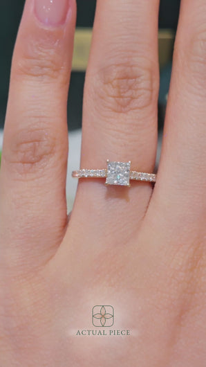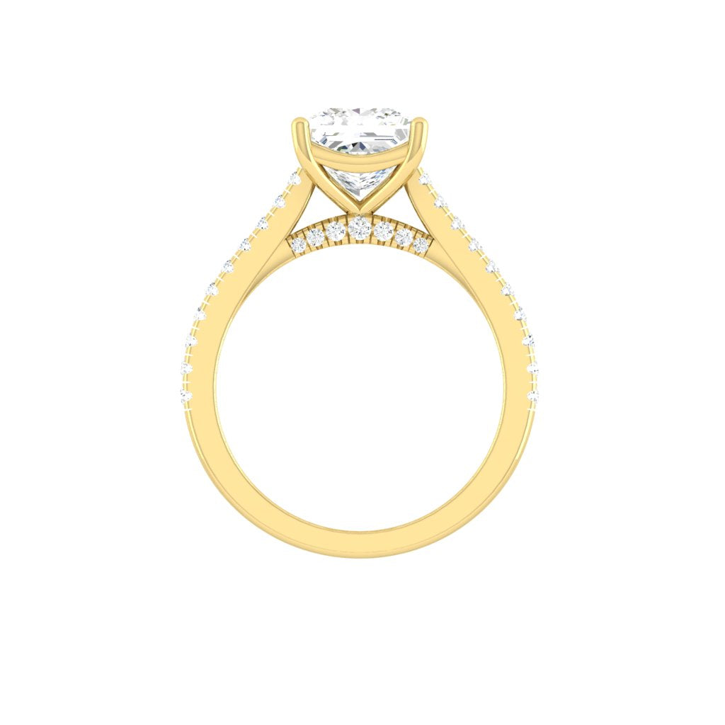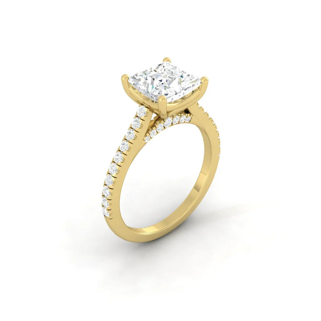 This is a piece made for the true romantic featuring the most stunning princess cut, displayed with a curved gallery rail and framed by bejeweled arches. She is beauty and brilliance, made into one timeless engagement ring.