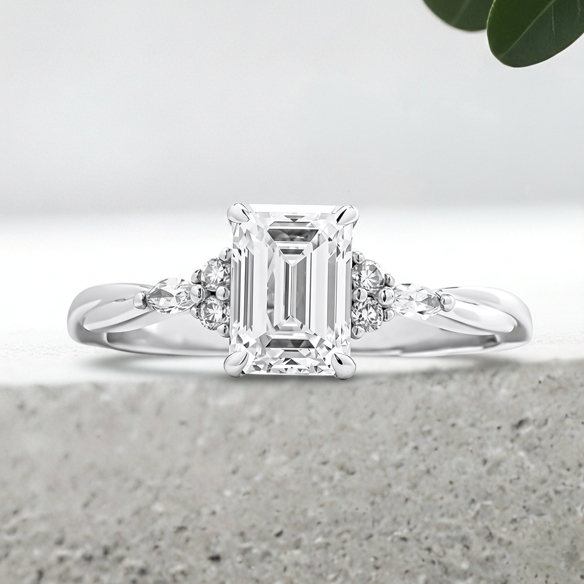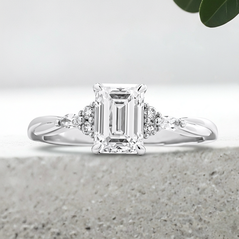 This forever piece features a low-profile setting, delicate cluster accents, and a graceful twisting band. Set with seven stones, this emerald-cut diamond engagement ring symbolizes that she is your perfect one, the missing piece that completes you. The twisting band speaks of your infinite love, a vow to stand beside her through every twist, turn, and chapter life brings.
