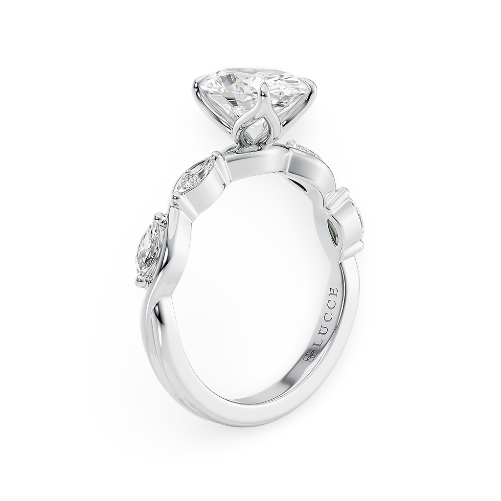 This forever piece features Lucce’s signature petal prongs and marquise-cut diamonds nestled in graceful, twisting vines. This oval cut diamond engagement ring's four delicate petal prongs symbolize her beauty, like a flower in eternal bloom, capturing the grace, warmth, and gentle strength that make her truly unforgettable. The marquise diamonds in twisting vines form an infinity design, representing a love that is forever true and constant through all times.