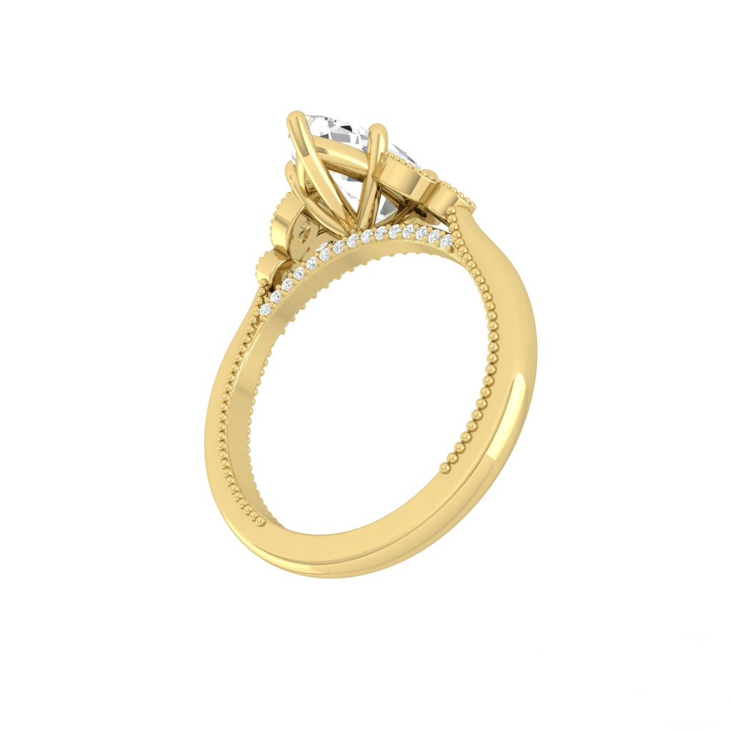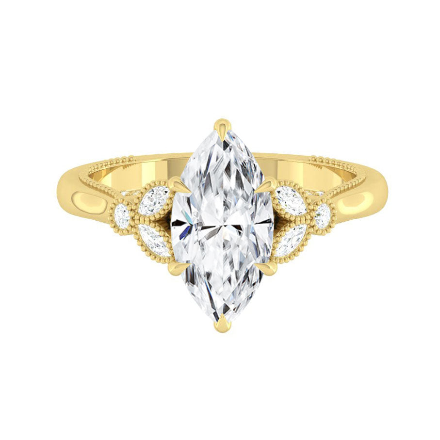 This forever piece is a graceful medley of a cathedral setting and a flush cluster design, crowned with a marquise-cut center stone. The marquise cut engagement ring's delicate side accents and vintage-inspired milgrain details evoke the quiet beauty of nature, textured like leaves, timeless like love. It’s a ring for the one who sees love as something fresh and life-giving, like a breath of spring. A promise to spend a life together, full of wonder, growth, and shared adventures.