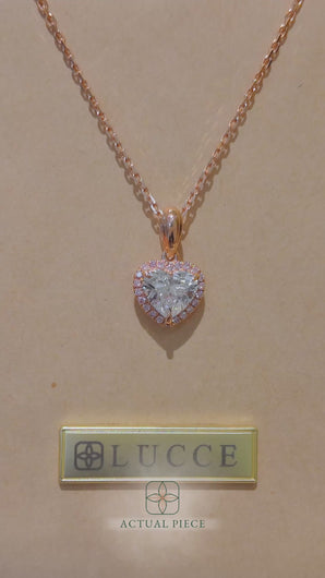 Crafted with precision and passion, this necklace features a dazzling heart diamond at its center, embraced by a delicate halo of shimmering accent stones, creating a mesmerizing display of brilliance and beauty. The design adds a contemporary twist.