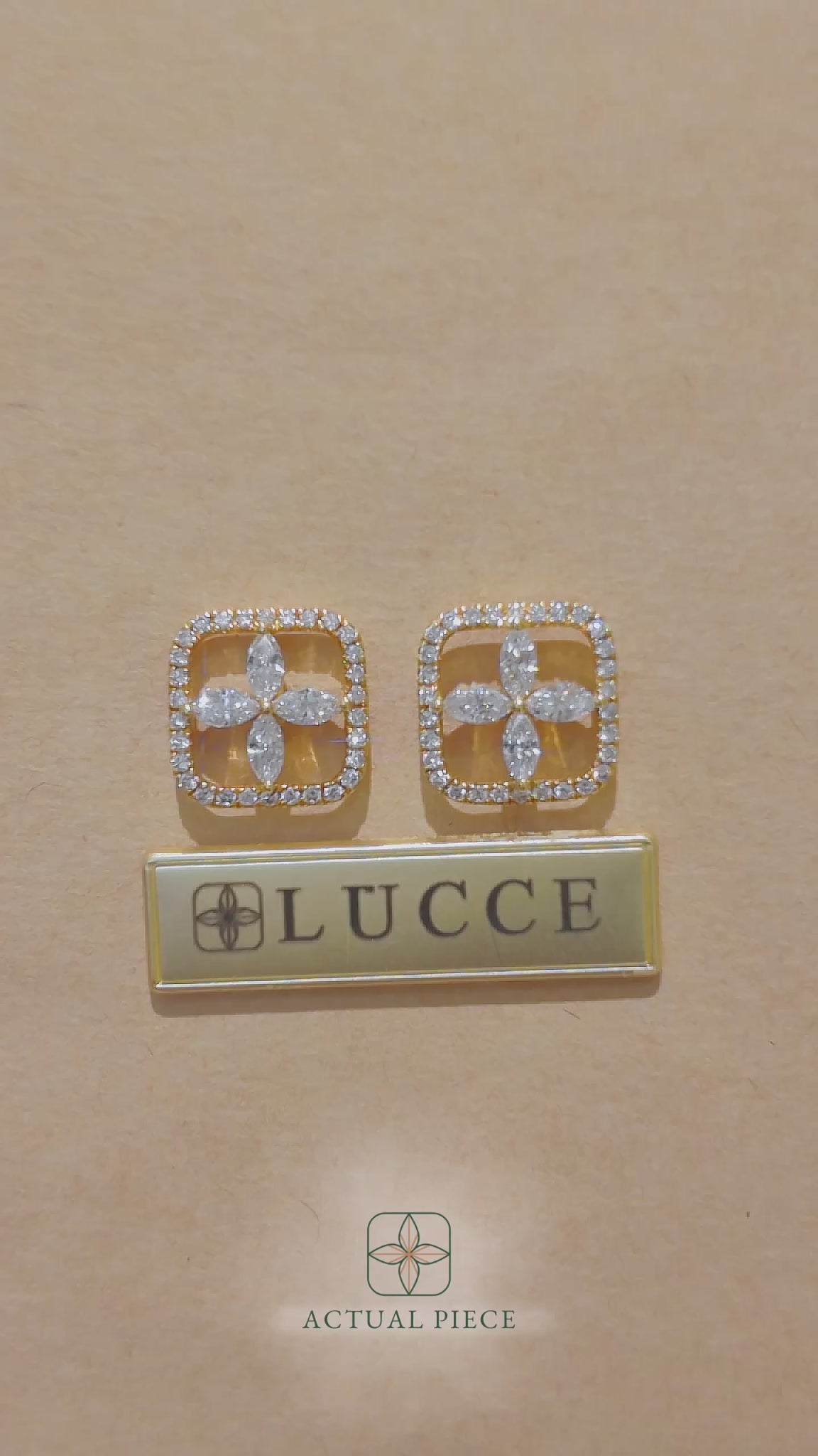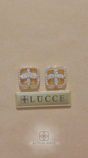These stunning pieces feature a sophisticated design, showcasing the Lucce brand emblem adorned with lab-grown diamonds. Each earring is meticulously crafted in a sleek square frame, highlighting a delicate floral motif at its center, surrounded by a halo of sparkling diamonds. Embrace the essence of luxury with Lucce Emblem Earrings, where impeccable craftsmanship meets ethical elegance.