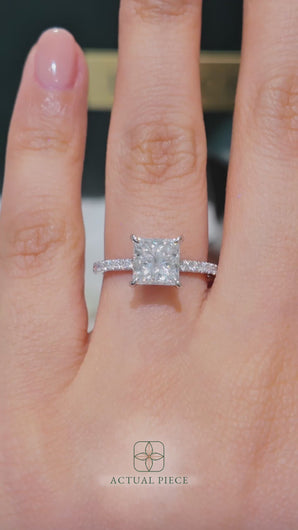 This forever piece features a uniquely wrapped hidden halo and a pavé band. From the top, this princess cut moissanite engagement ring appears simple and elegant, but from another angle, a hidden sparkle is revealed, just like her and the quiet depth of the love you share. The wrapped halo symbolizes your heartfelt promise to keep her safe, embraced in your arms and cherished for all the days to come.