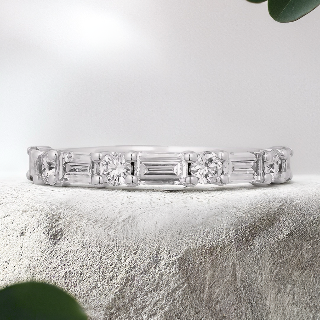 This brilliant half-eternity band of alternating baguette and round cut stones brings these two different cuts into a beautiful harmony of light and shine.