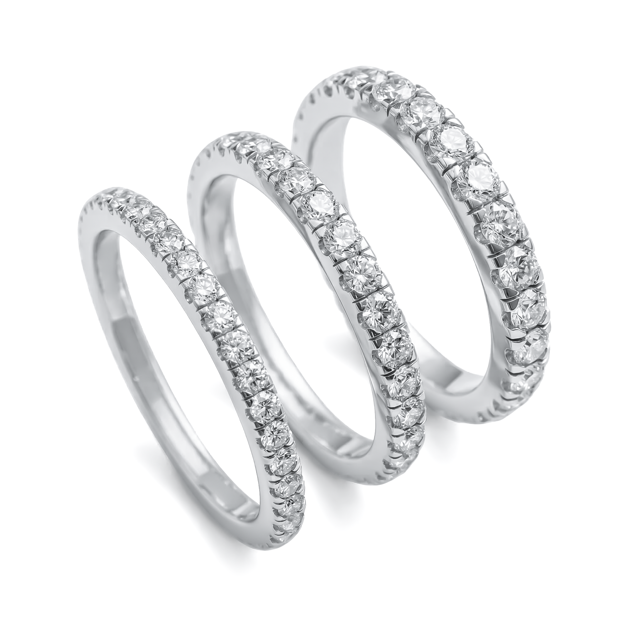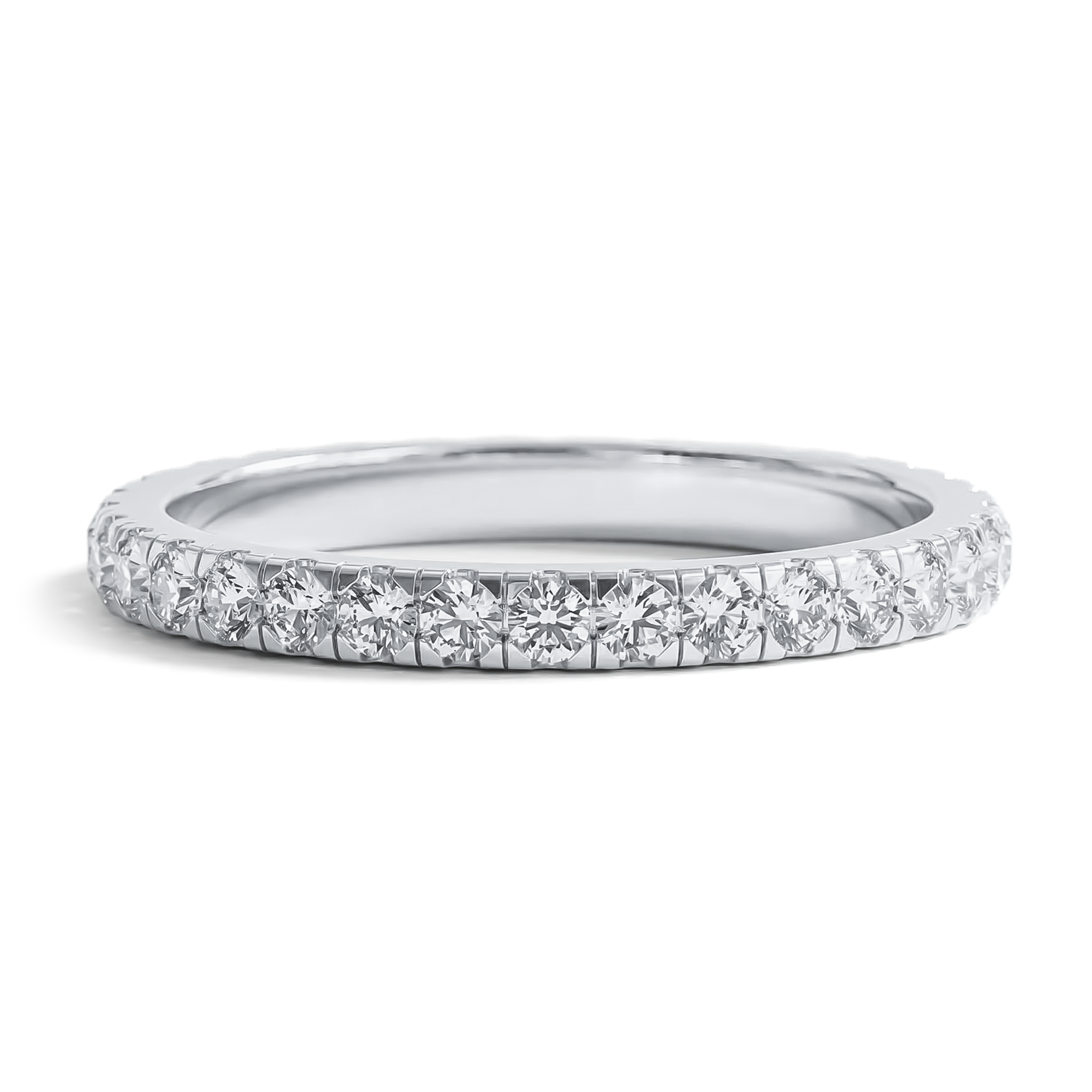 This classic wedding ring features a full eternity of glittering row of pavé accents and serves as the perfect complement to many engagement ring styles.