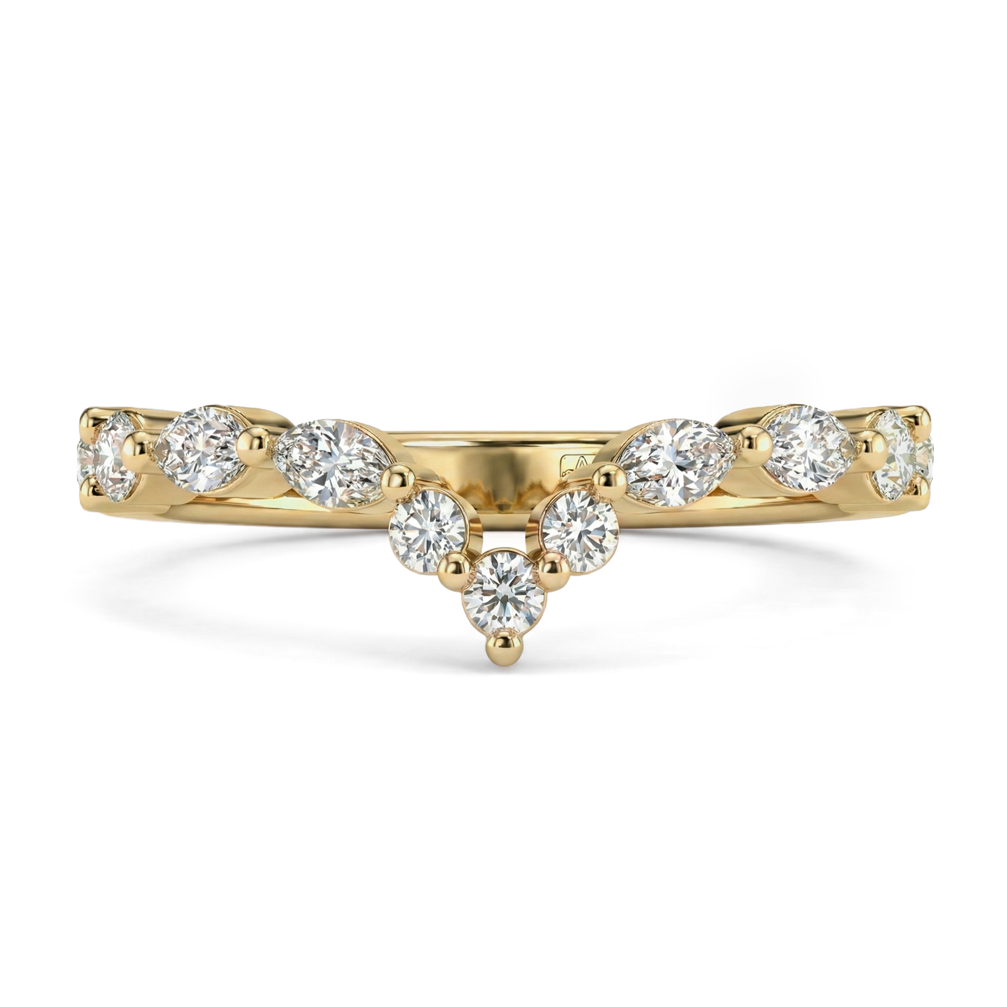 Floating shared prong alternating marquise and round gemstones shimmer from the top half of this delicate and dazzling wedding band for a spectacular look.